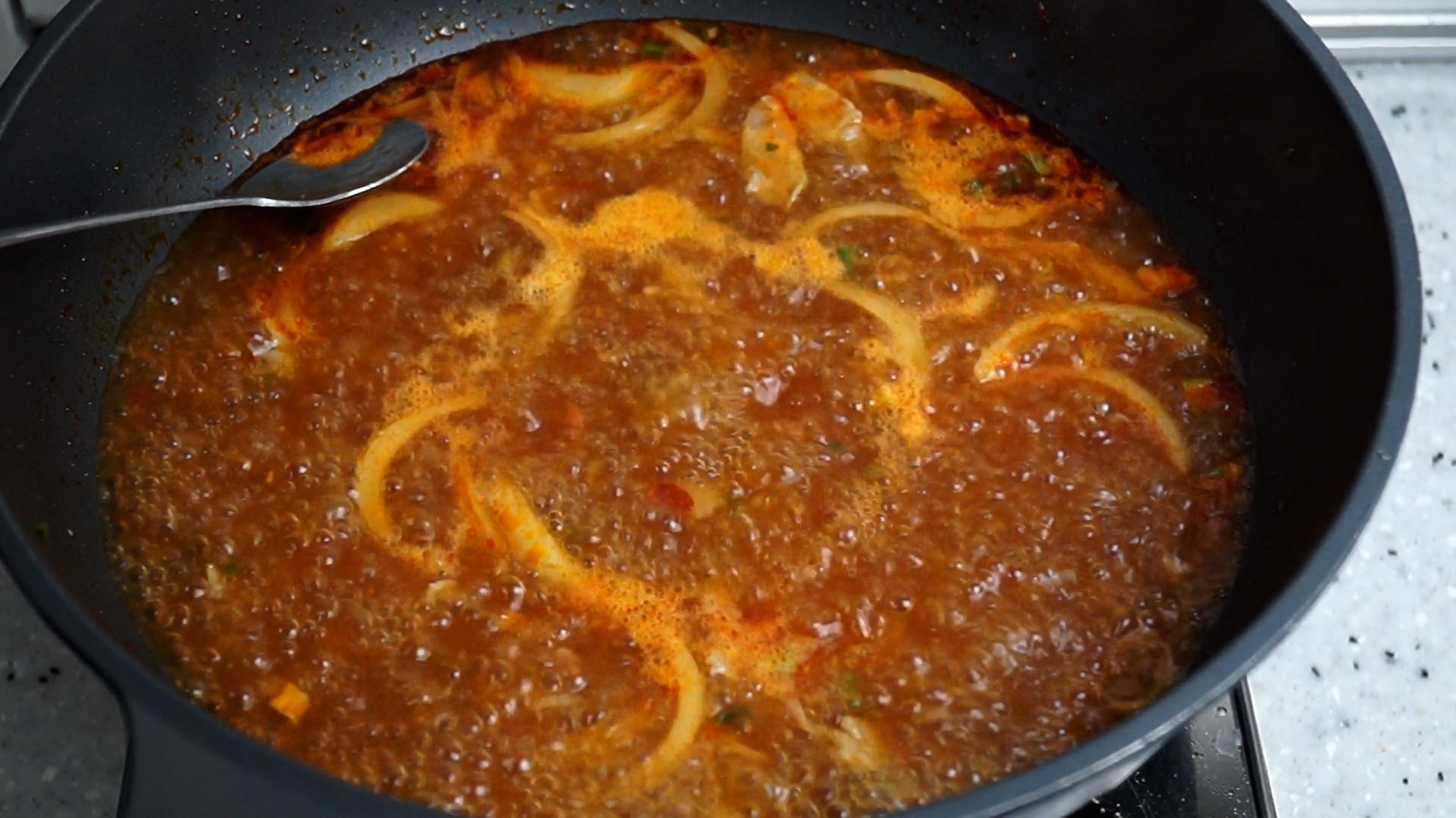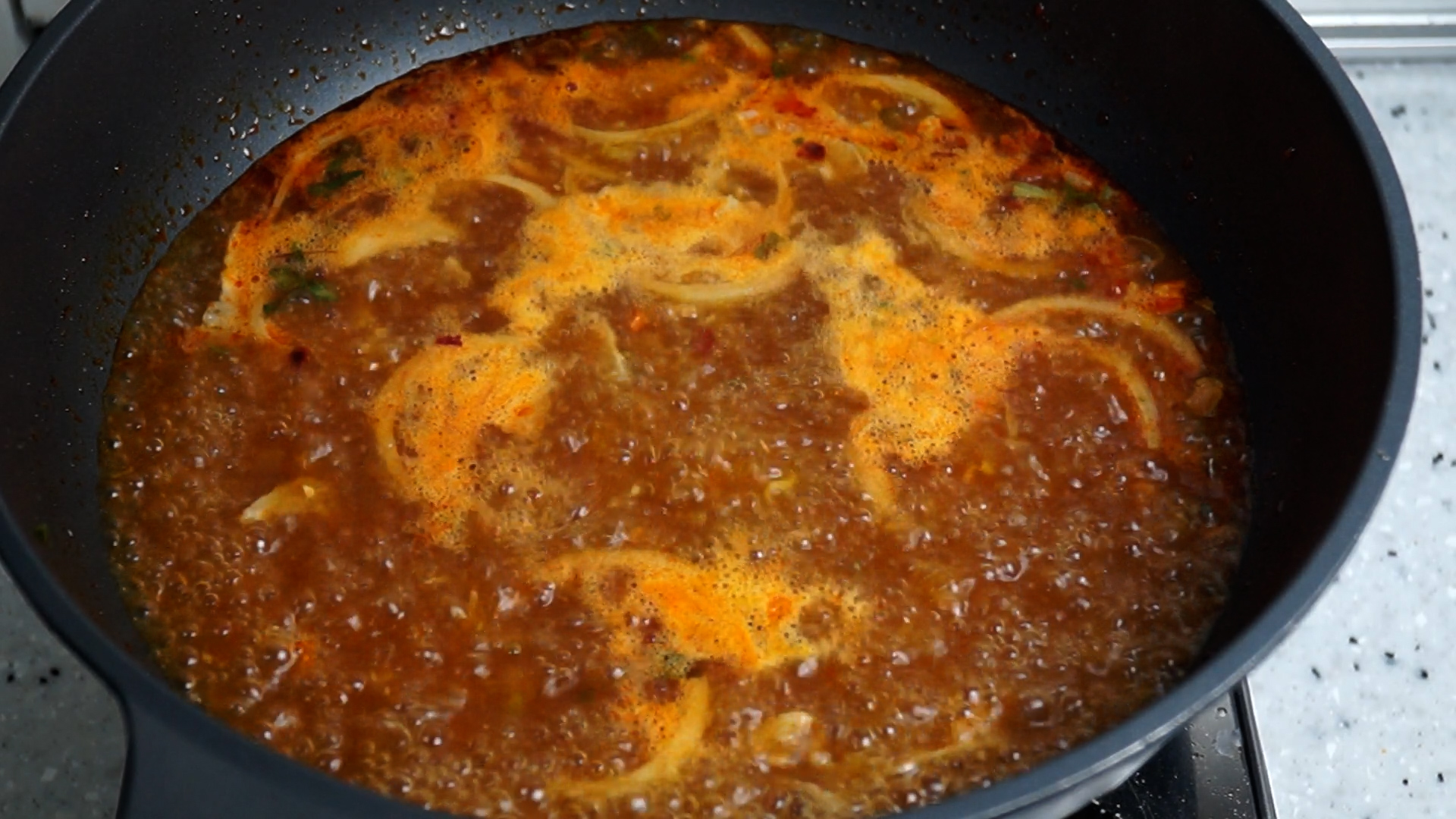 12. 혹시 기름이 너무 많아서 거슬리시면 다 걷어내지는 마시고 절반만 걷어내세요. 지금 떠오르는 기름에 얼큰한 맛이 농축되어 있으니 절대 전부 걷어내지는 마세요.