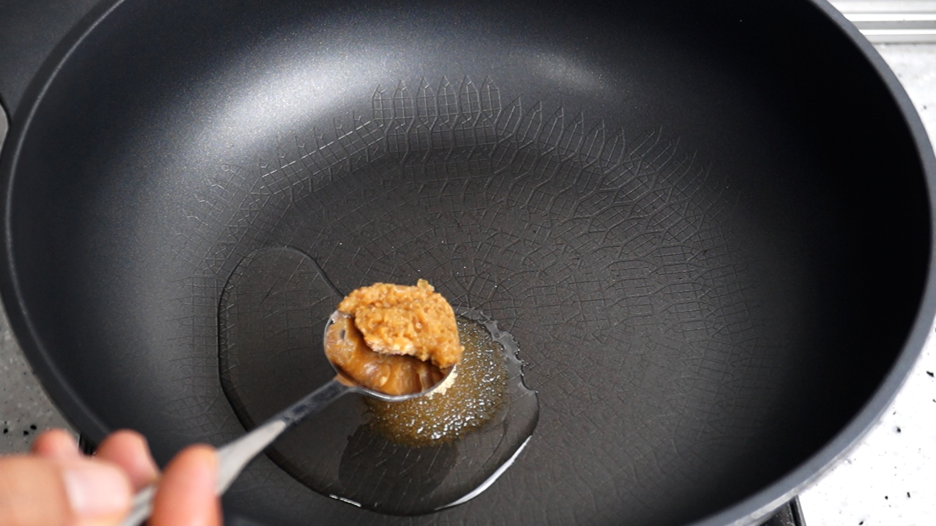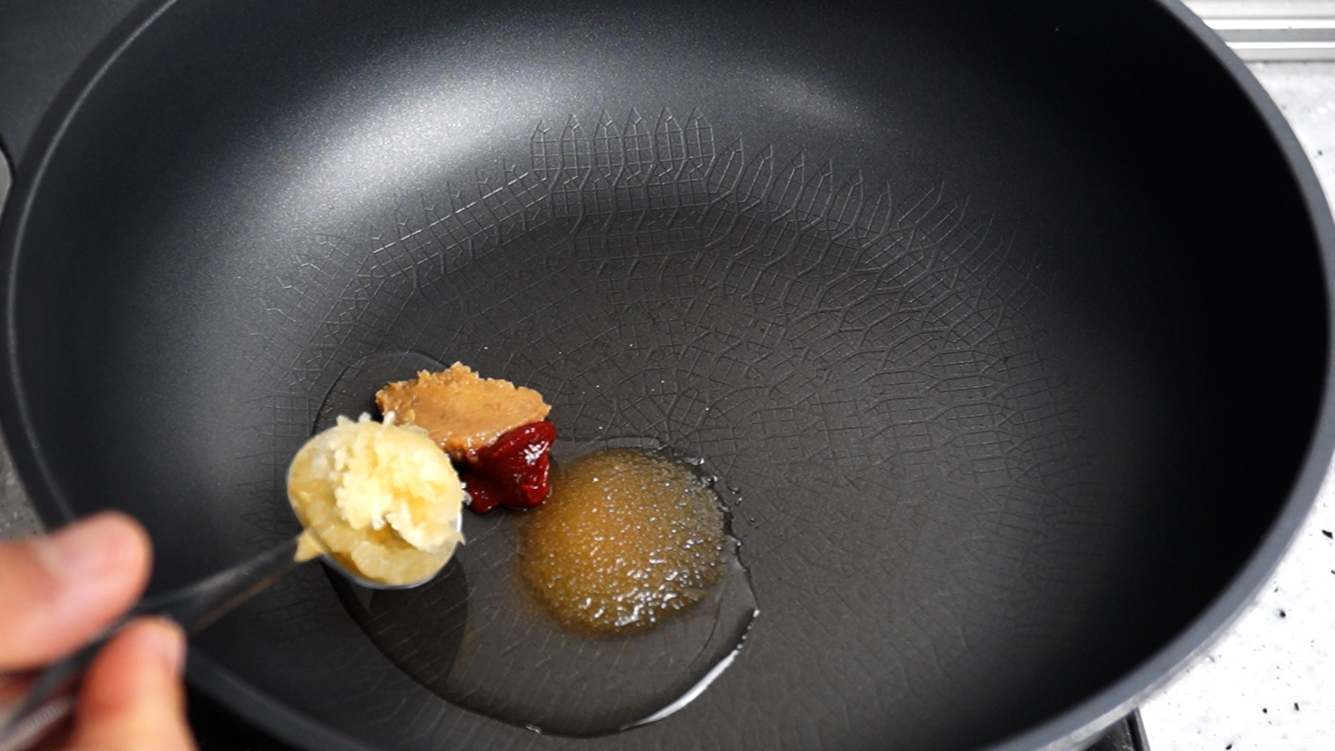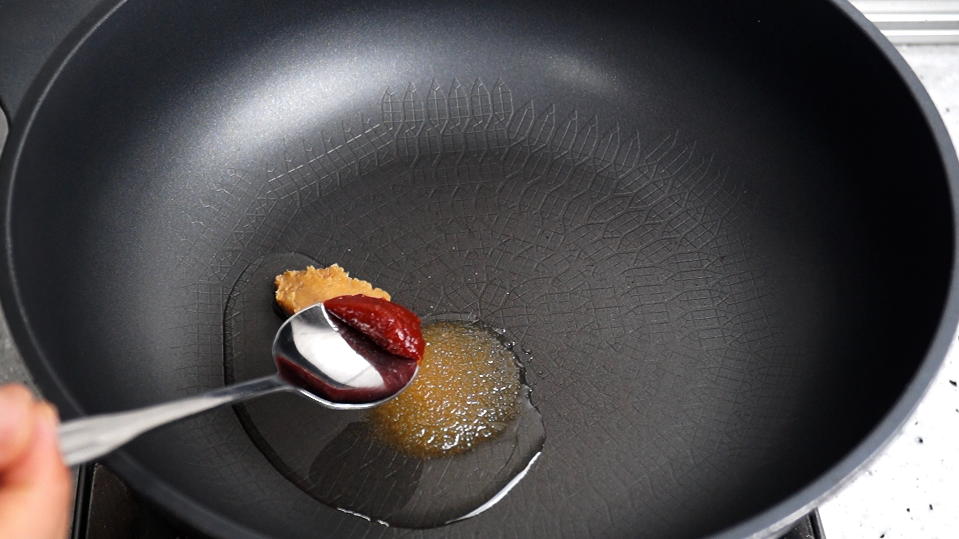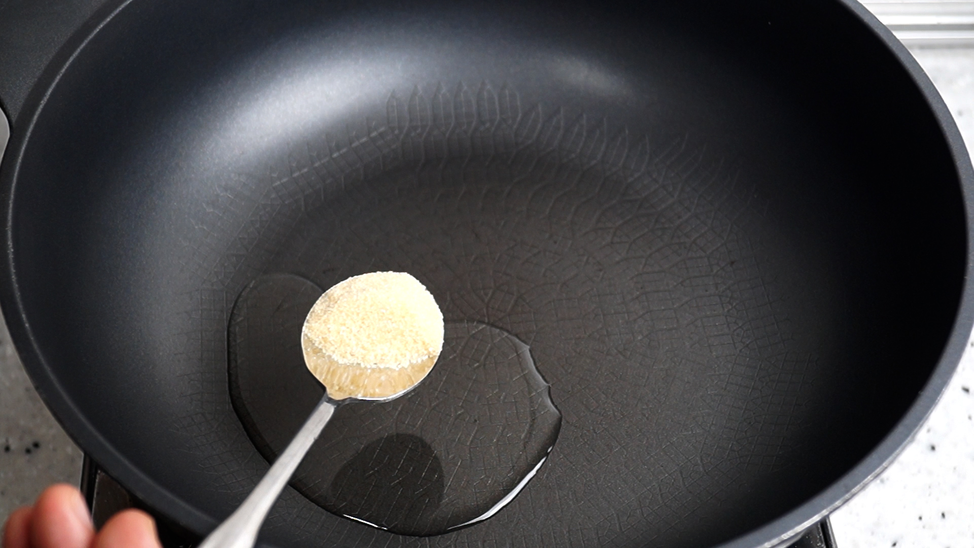 4. 코팅된 웍에 불올리지 않은 상태에서 기름에 양념란에 표기된 재료를 전부 부어줄거에요. 식용유를 부은 다음 설탕을 깍아서 반스푼 넣어주세요.