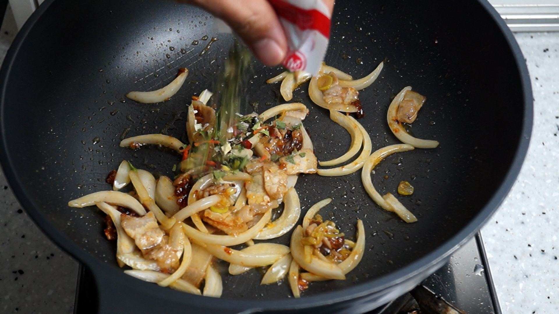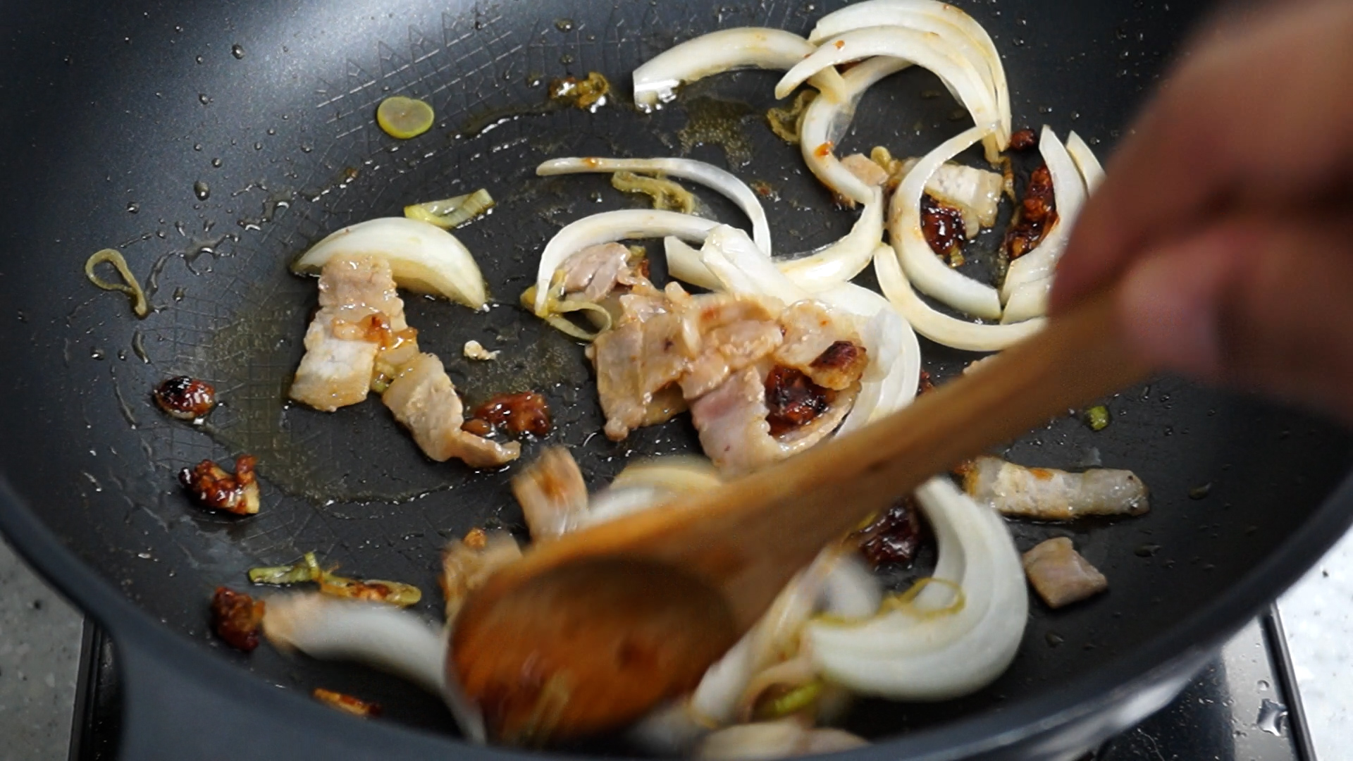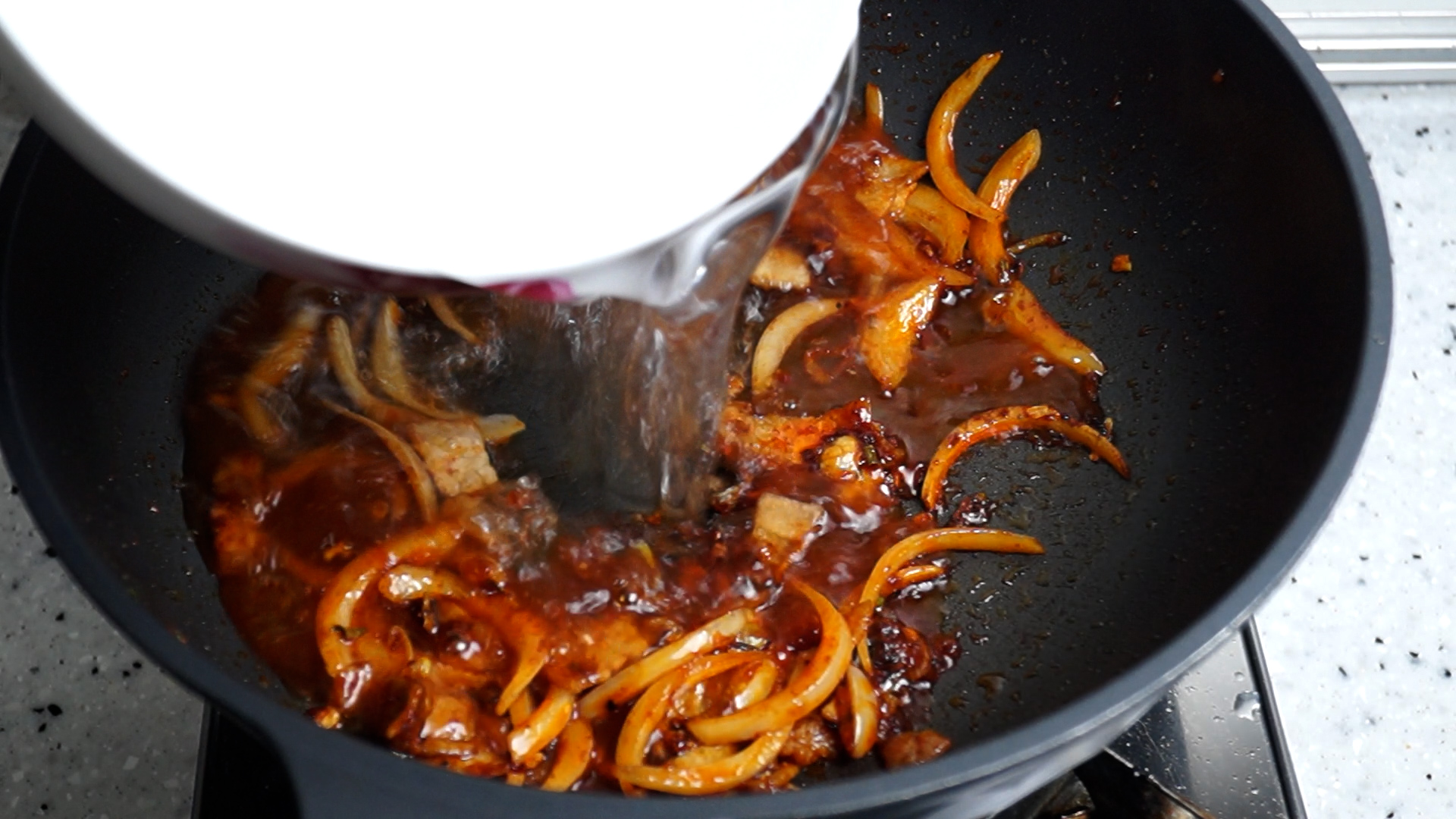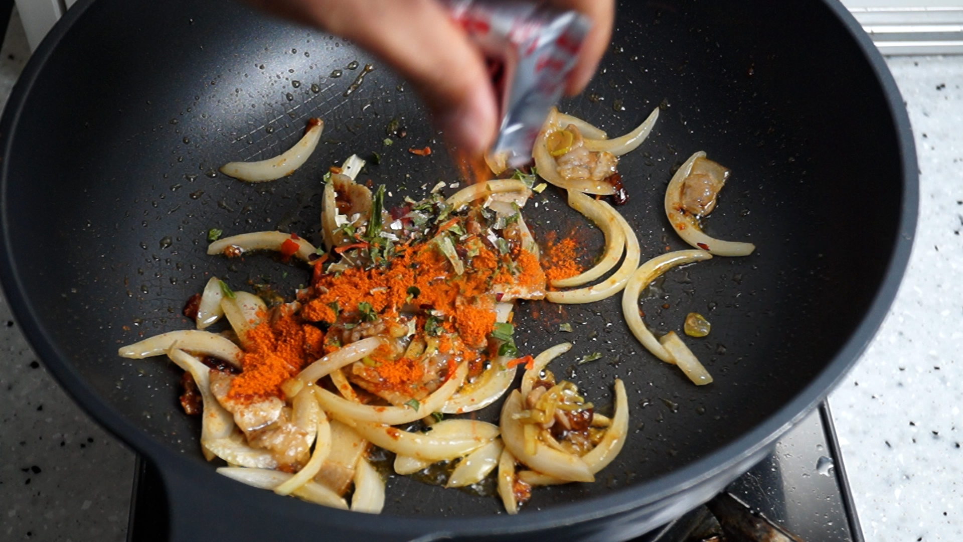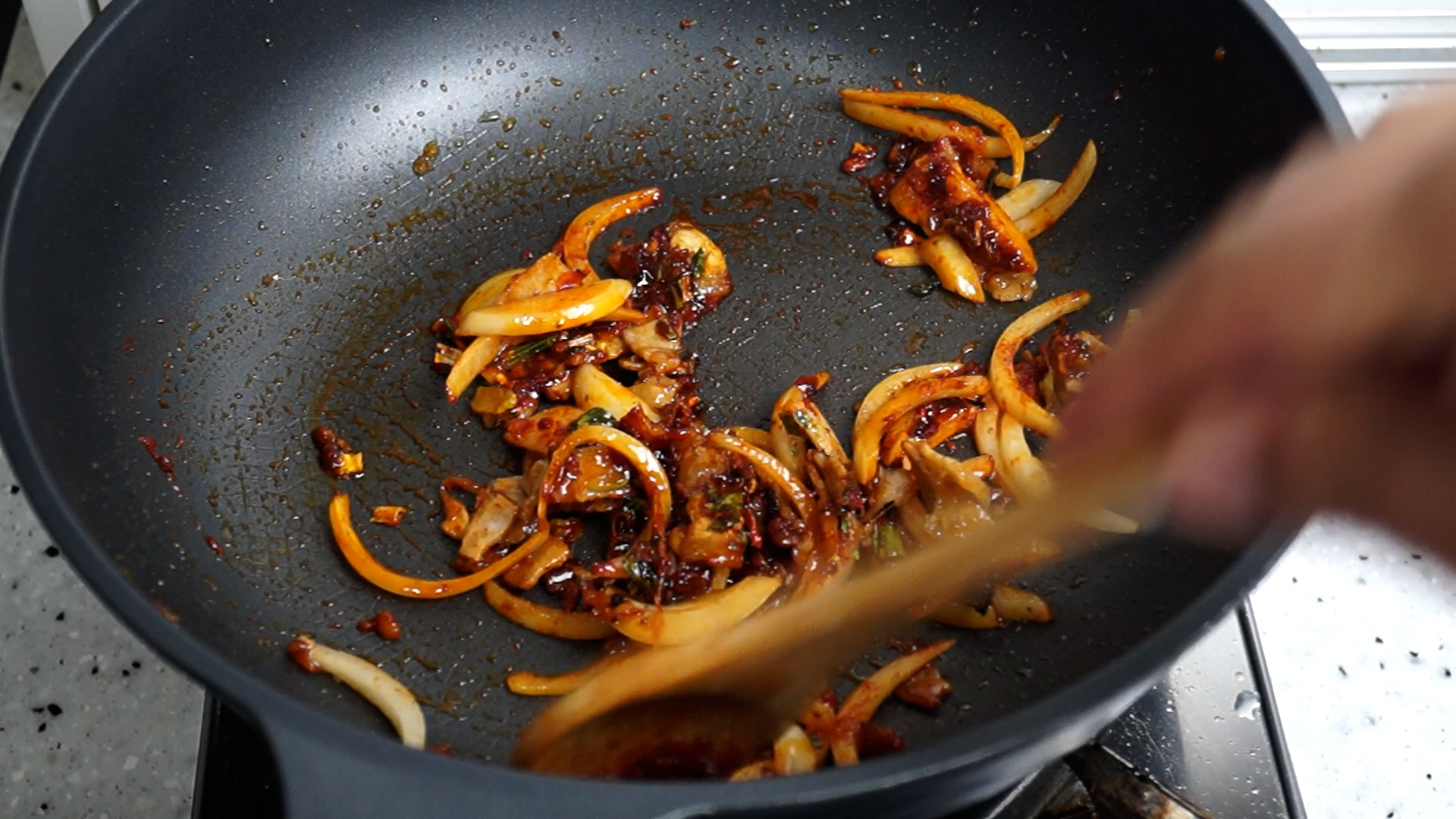 8. 양파를 넣고 불을 중불로 올리고 섞으면서 1분 볶아주세요.