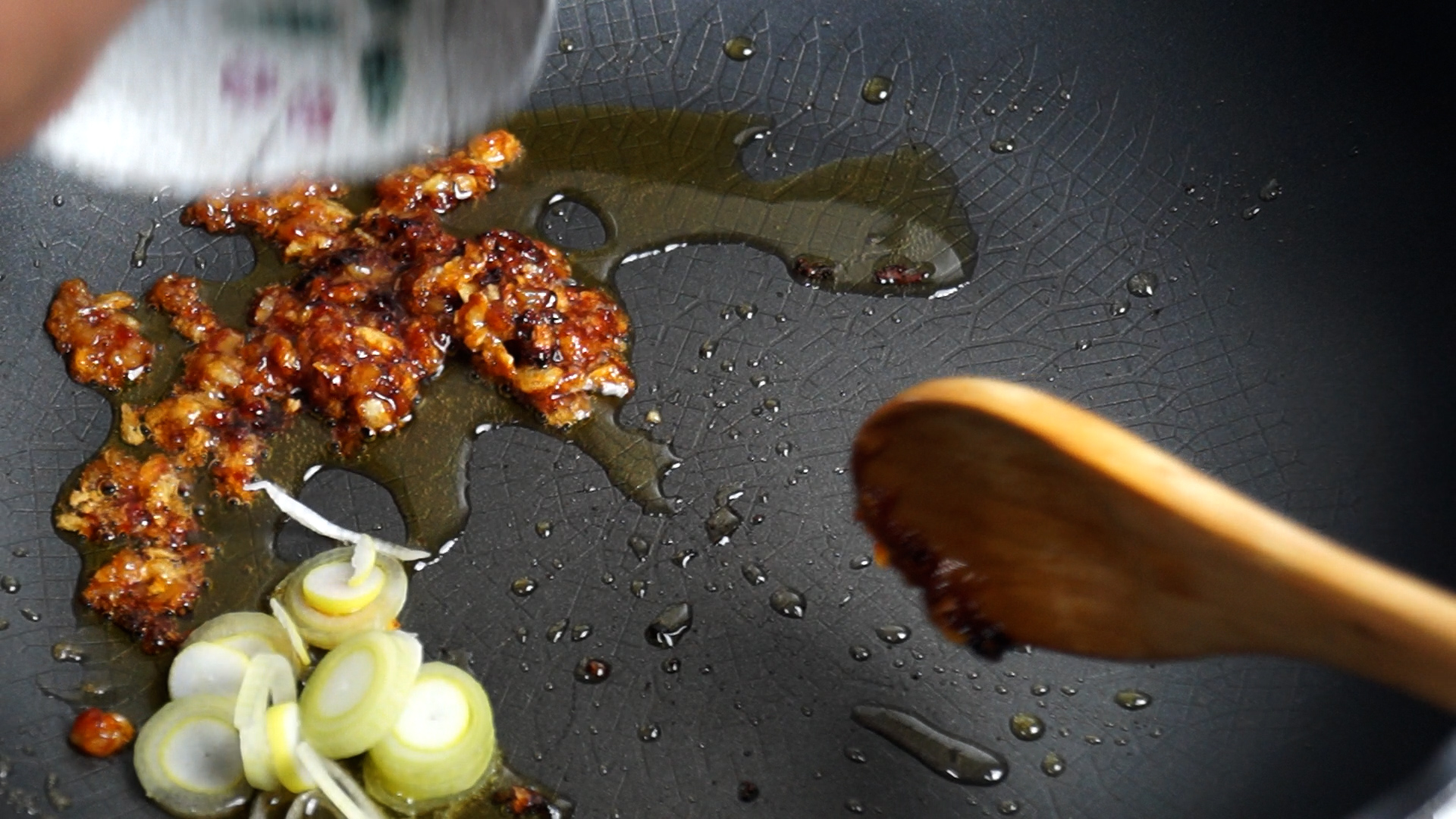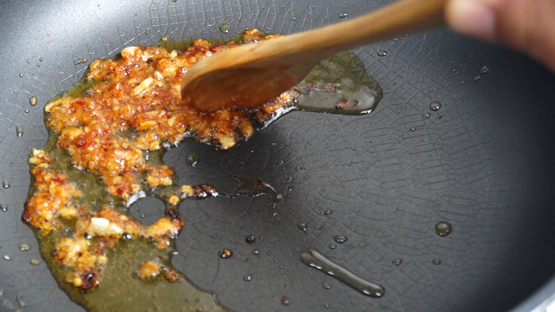 6. 간마늘을 넣고 불을 약불로 올려서 기름이 자글거리면 섞으면서 2분을 볶아주세요. 불이 강하면 금방 타버리니 불조절 주의하세요!