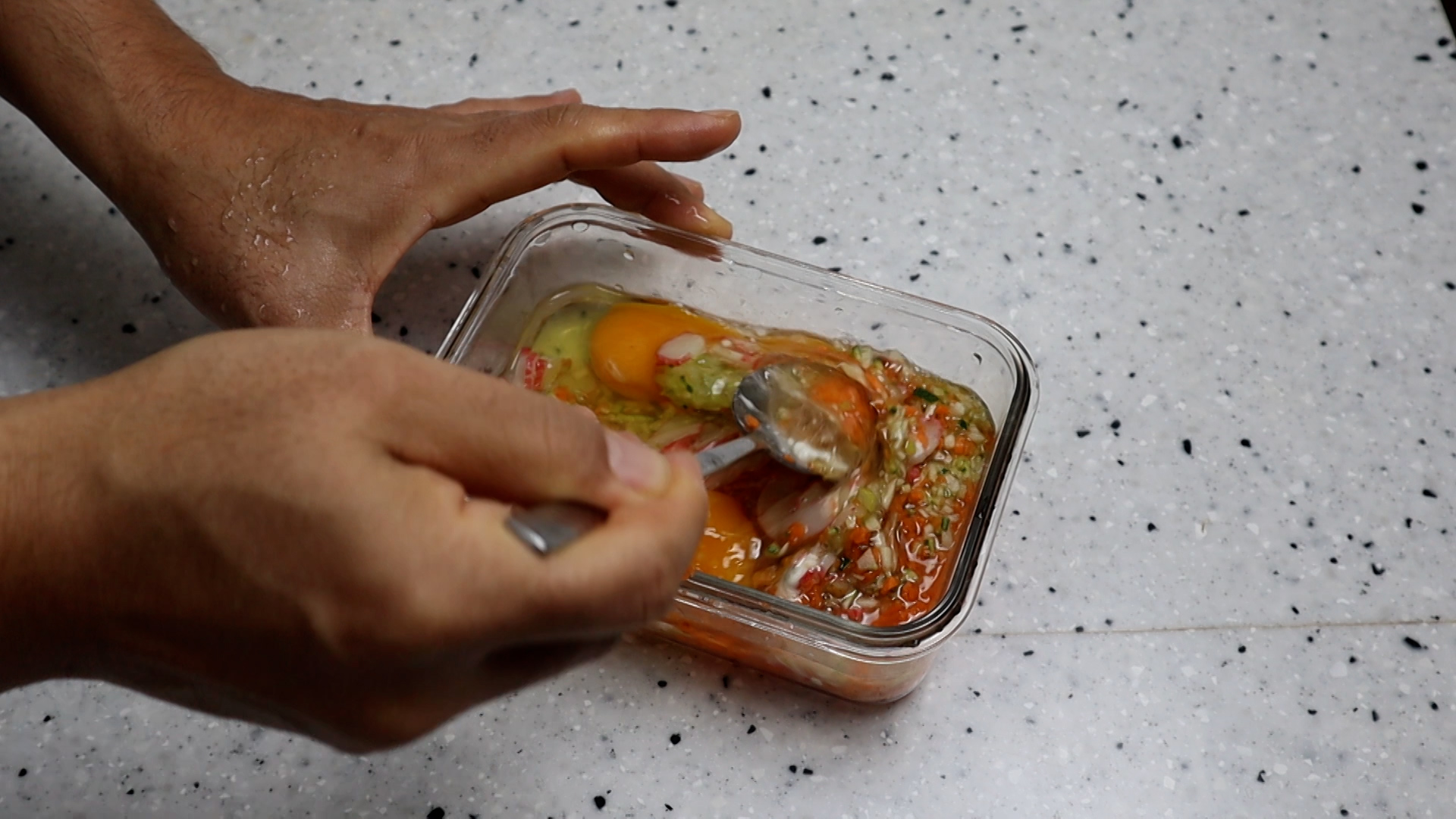 4. 대략 500~600cc 정도 크기의 내열용기를 준비해서 다진 재료를 전부 넣어주세요. 전자렌지에 돌릴거라 내열용기 필수 입니다!