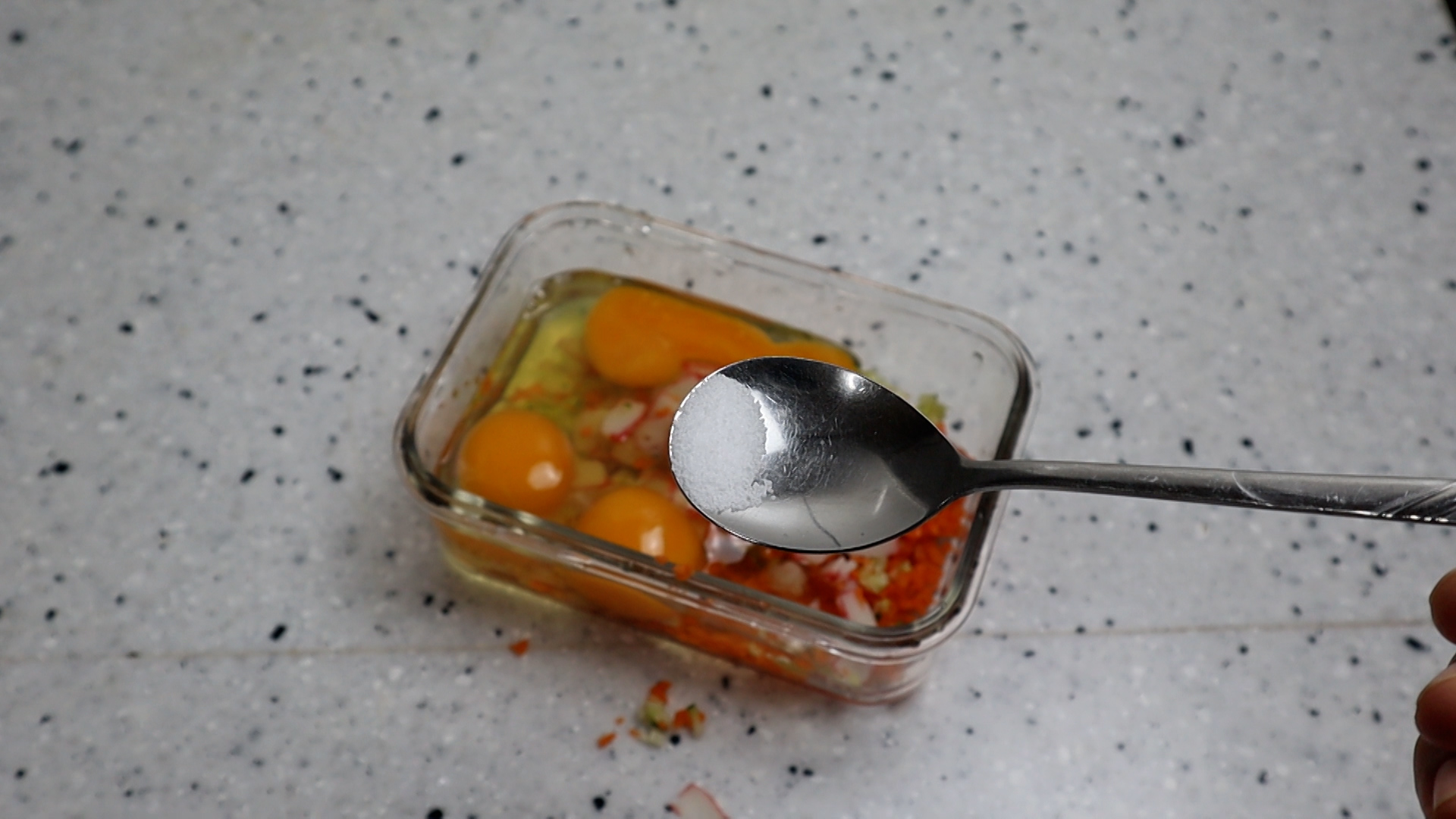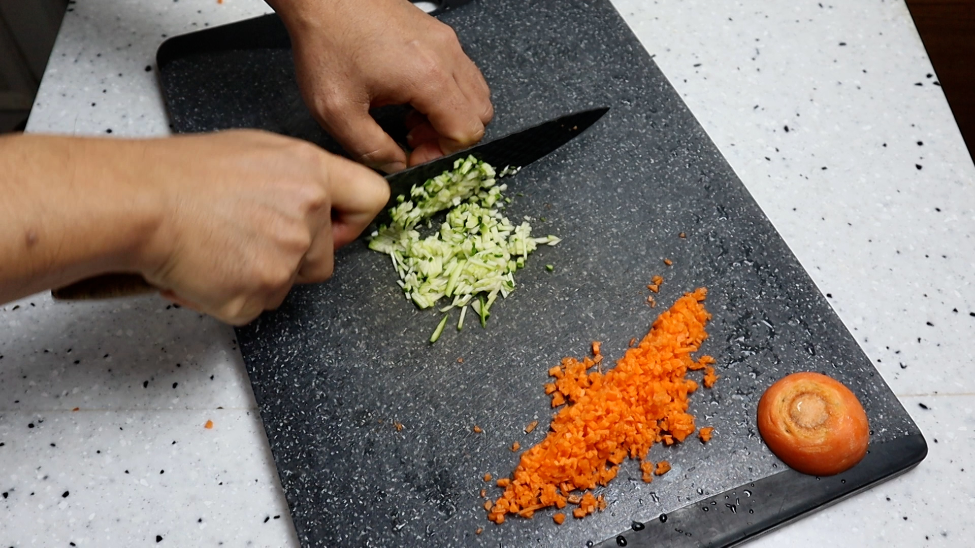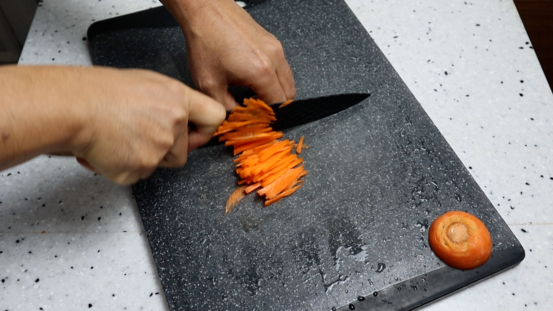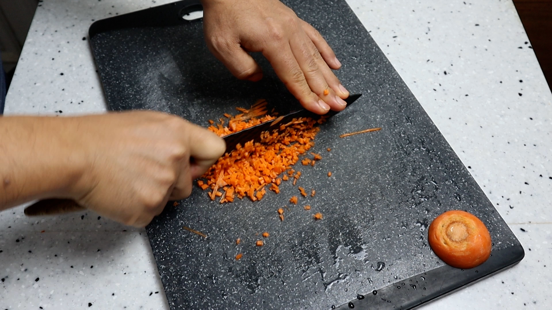 1. 당근은 최대한 얇게 채를 썰어서 잘게잘게 다져주세요. 잘게 다져서 대략 3큰술 정도 되는 양입니다.