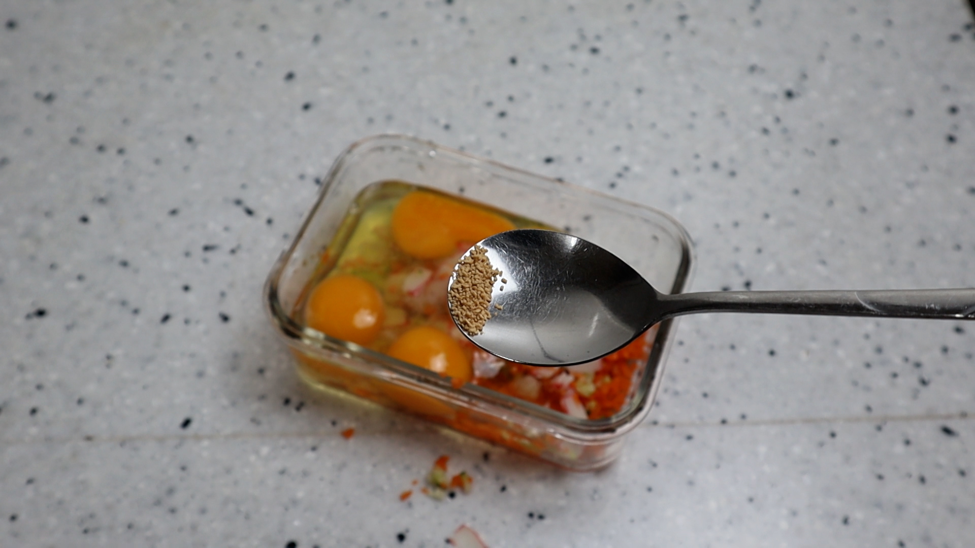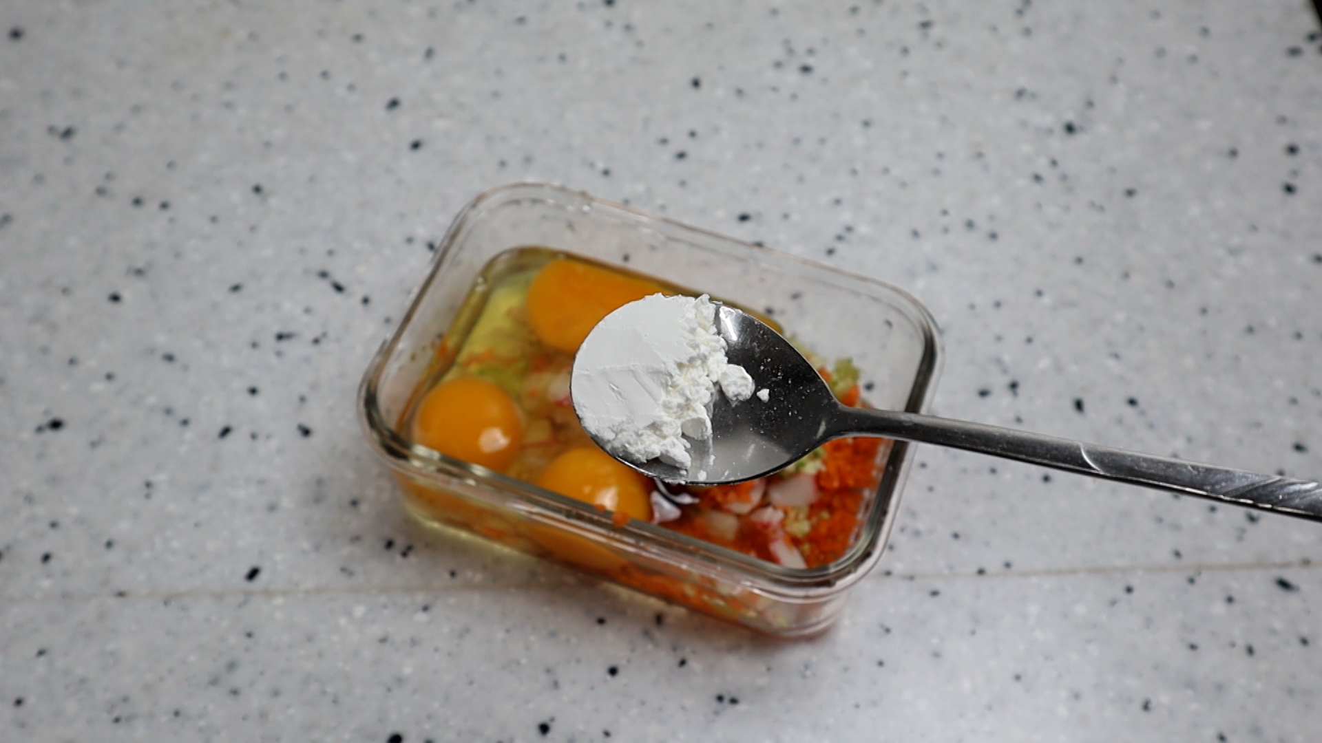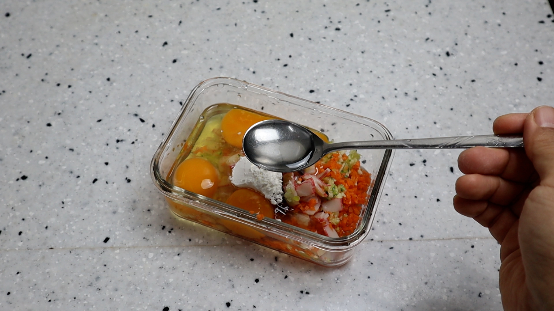 10. 참기름을 넣은 다음 전분가루를 살짝 넣어주세요. 전분가루가 들어가면 계란찜이 풀어지지 않고 뭉쳐서 탱글탱글한 계란찜을 만드실수 있습니다.