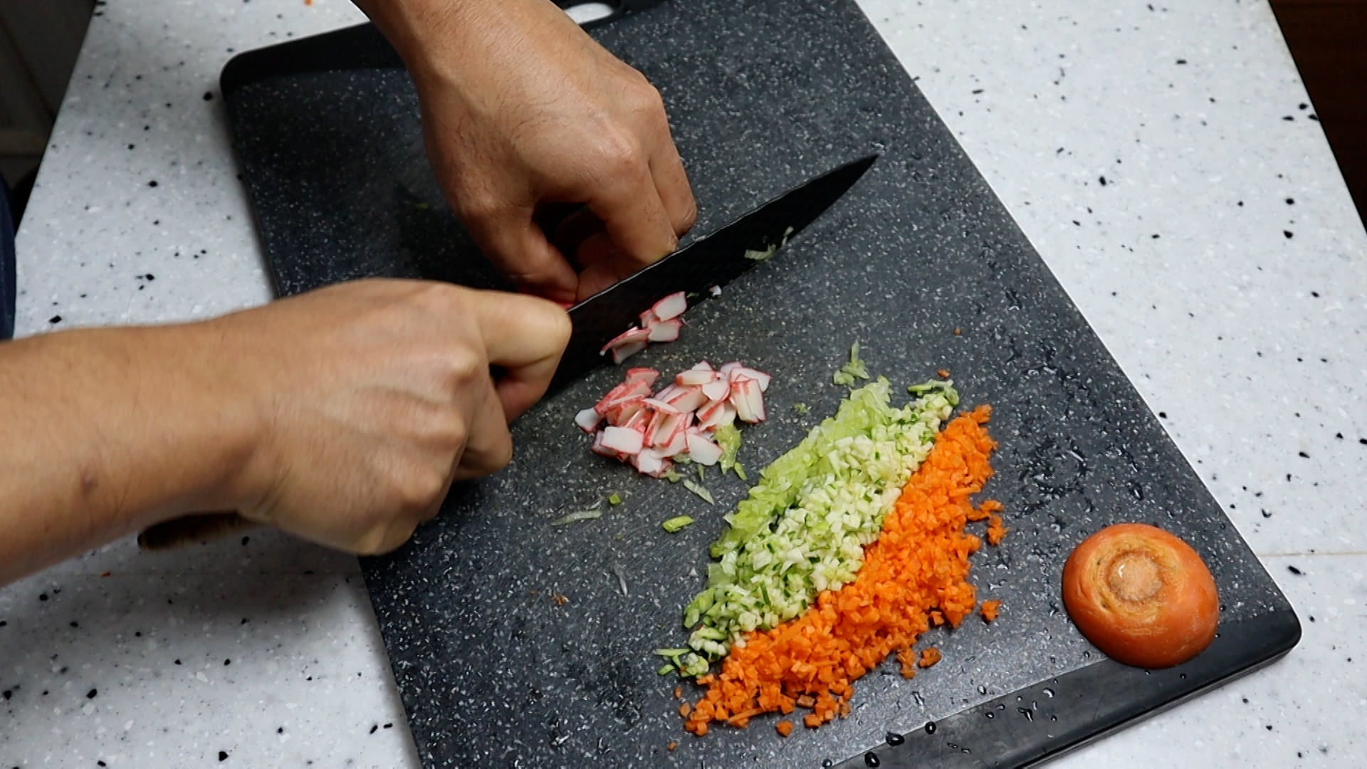 3. 맛살 1줄을 잘게잘게 썰어주세요. 맛살은 없으면 생략하셔도 괜찮아요~