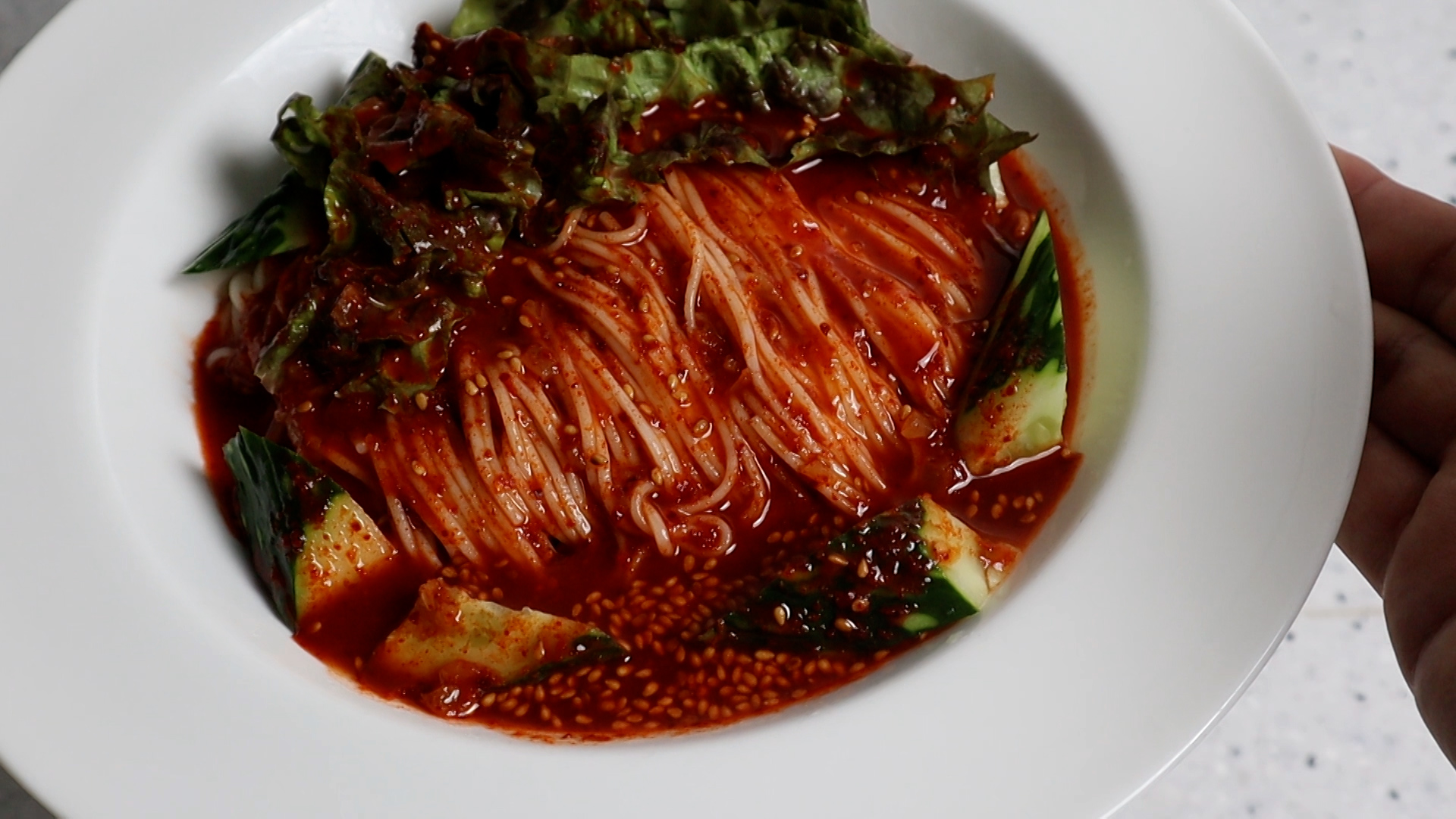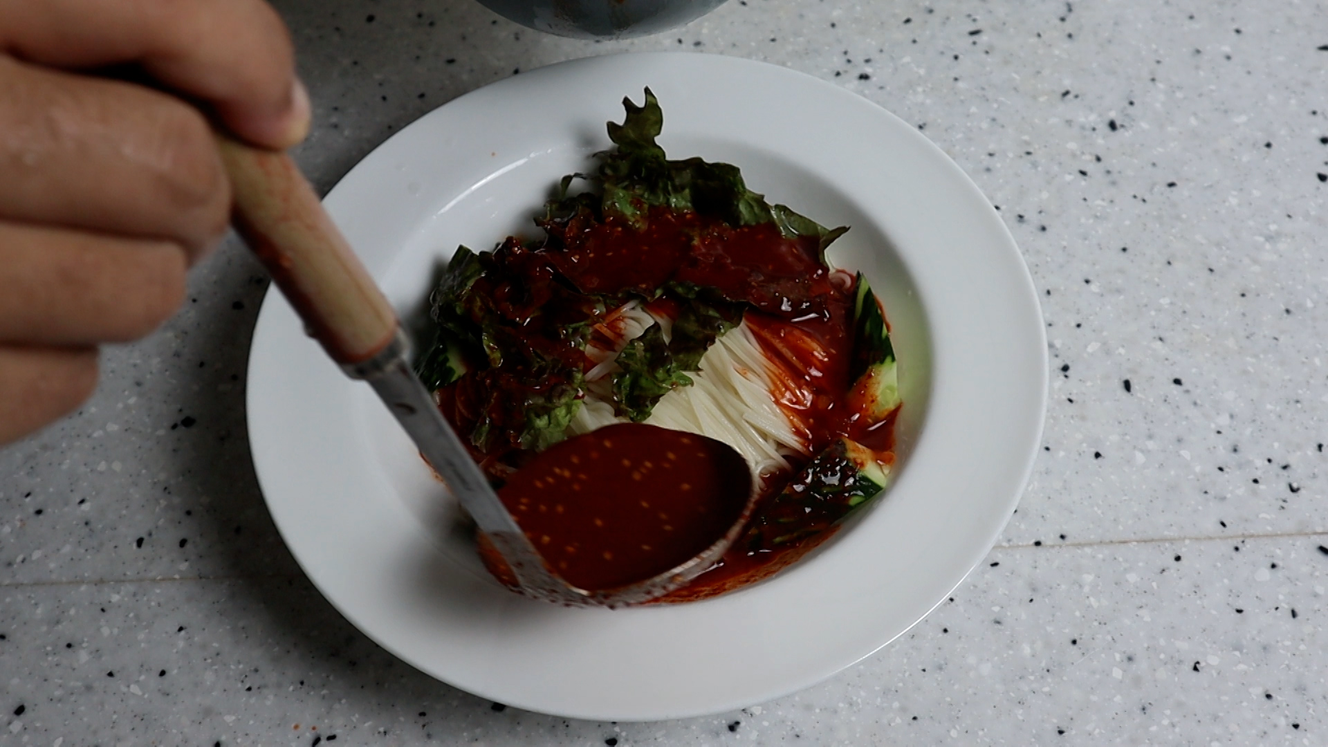 11. 국수를 그릇에 담고 야채를 올린다음 양념을 1~2국자 부어주세요! 뻑뻑한 스타일의 양념이 아니라 수분이 많아 차박차박 비벼먹는 스타일이라 넉넉하게 부어주셔도 좋아요~