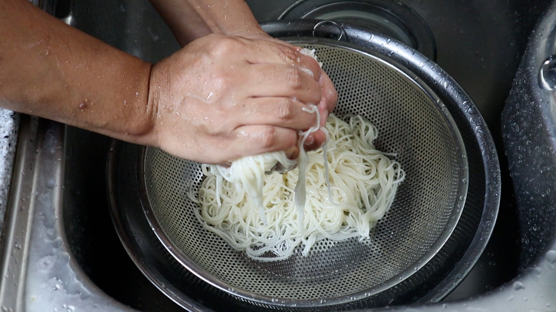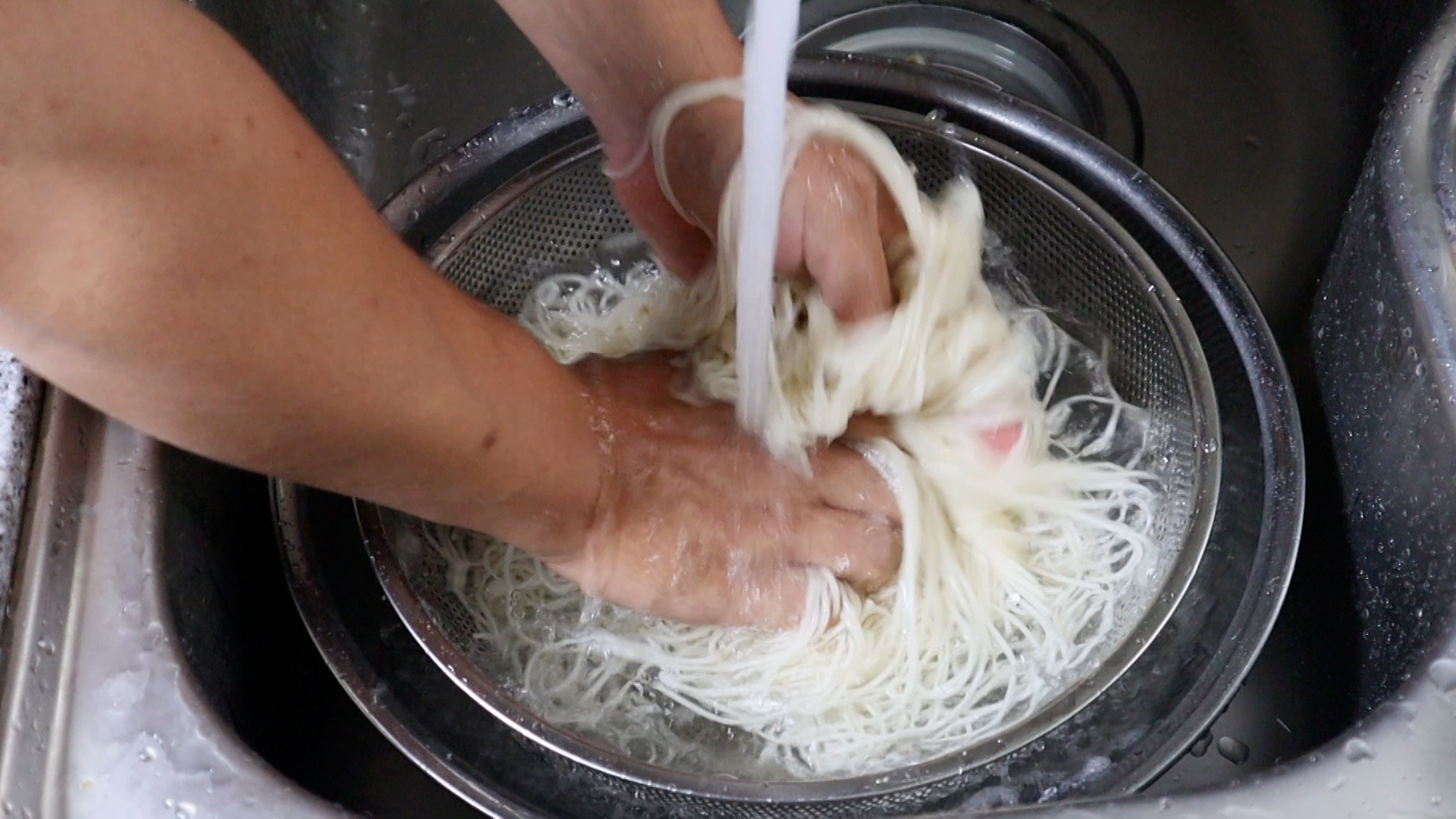 9. 물을 넉넉하게 끓여서 국수를 삶아주시고 찬물에 3~4차례 빡빡 문질러 가면서 씻어주세요. 비빔국수는 찬물에 전분기를 박박 씻어내줘야 더욱 깔끔한 국수를 즐길수 있습니다.