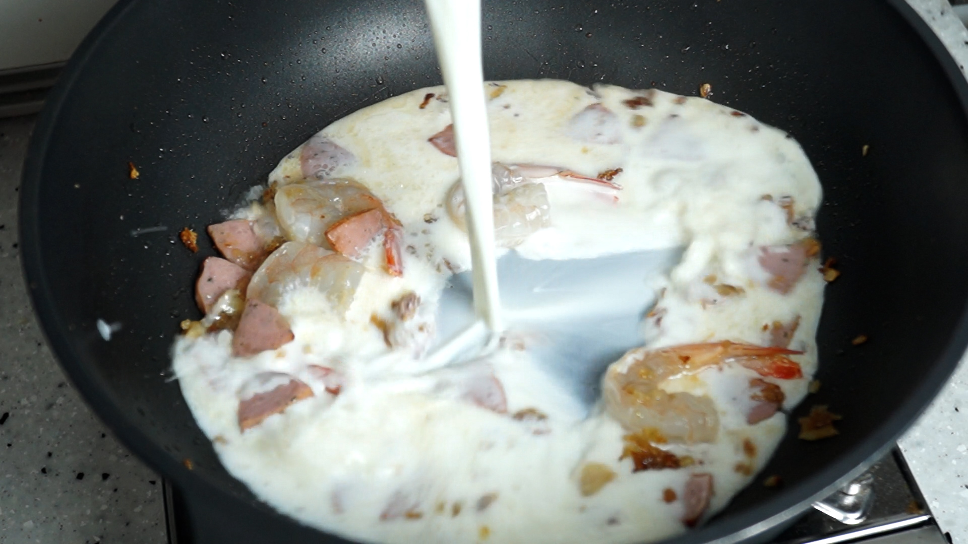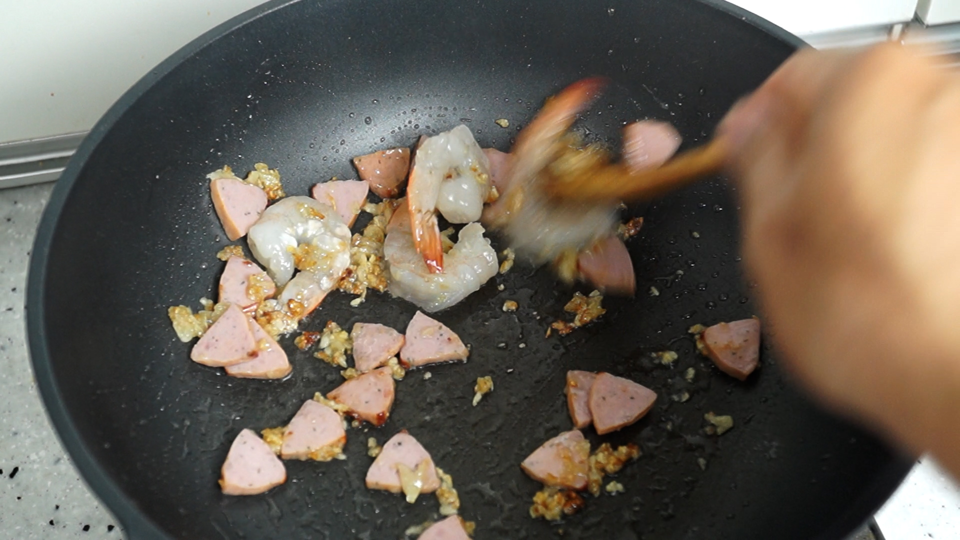 11. 새우와 햄을 넣고 불을 중불로 올리고 1분정도를 볶아주세요.