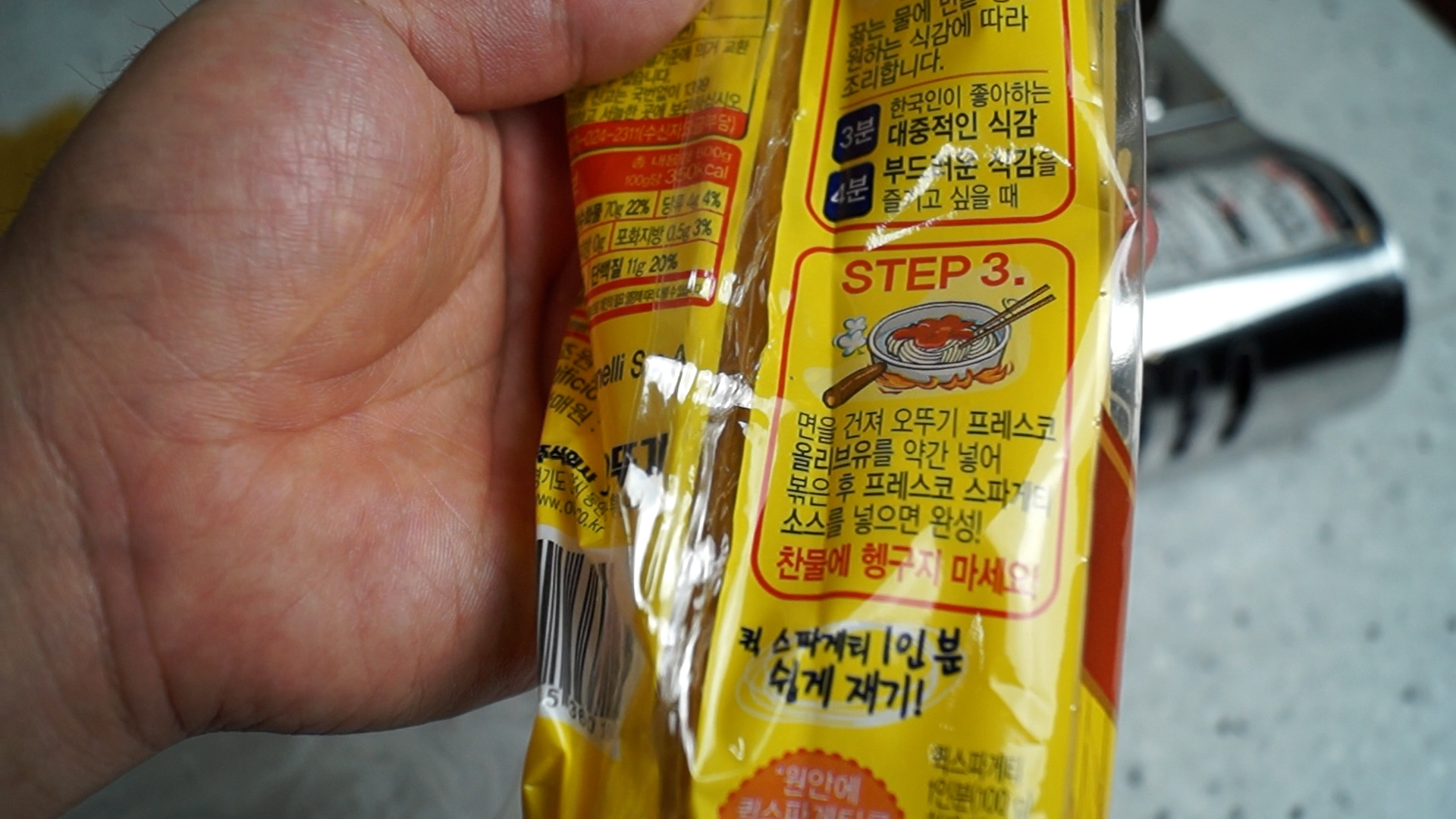 2. 스파게티는 아무거나 1인분을 준비해주세요. 요즘은 3~4분 만에 익는 스파게티면도 나오더라고요. 성격급하시면 저처럼 3~4분 삶는 이런제품을 사보세요.