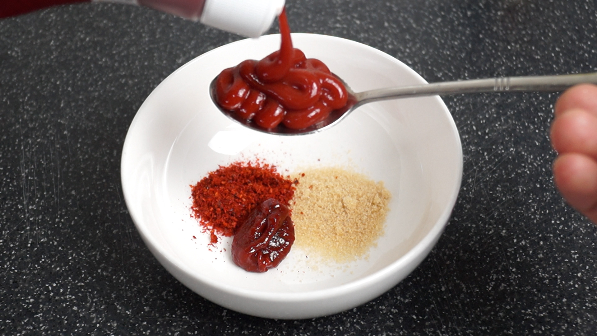 6. 스파게티 소스가 없으니 케찹을 좀 넣어볼께요~ 숟가락에 고봉으로 쌓으니 1스푼에 20g 정도 나가더라고요.