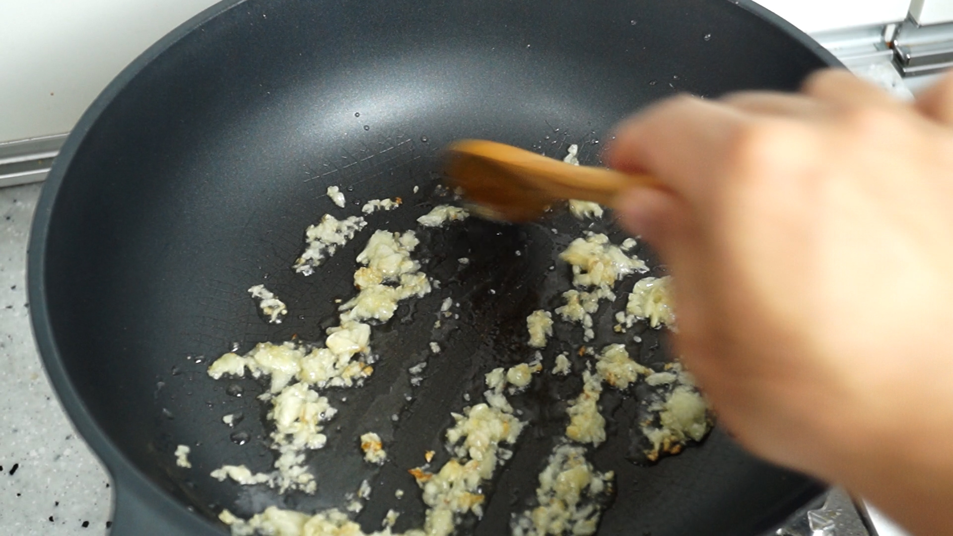 10. 팬에 식용유와 마늘을 분량껏 넣고 약불에 마늘이 자글거리면 2~3분 튀겨서 마늘향을 확! 살려주세요.