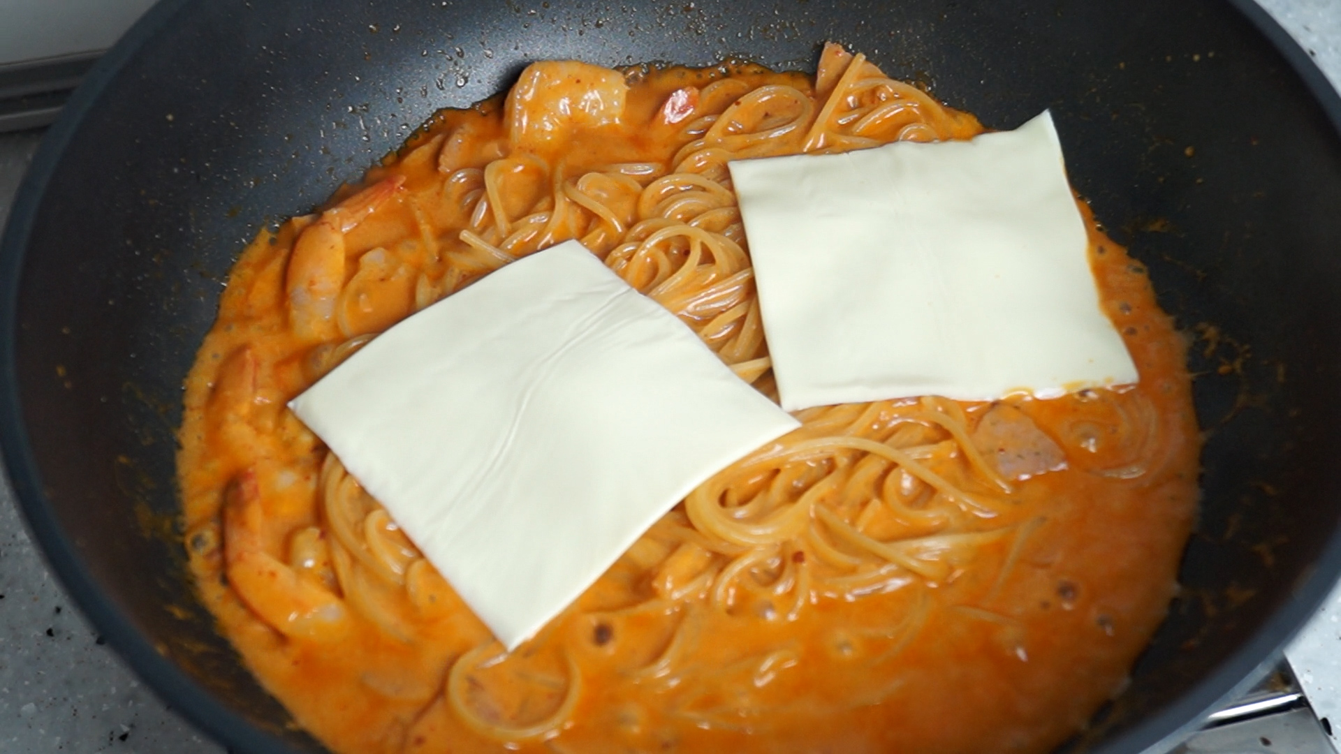 17. 치즈를 골고루 녹여가면서 양념이 완전히 꾸덕해 질때까지 볶아주세요. 혹시 피자시켜 드시고 남은 1회용 파마산 치즈가루 있으면 그걸 1~2봉 뿌려주시면 더더더 맛있답니다.