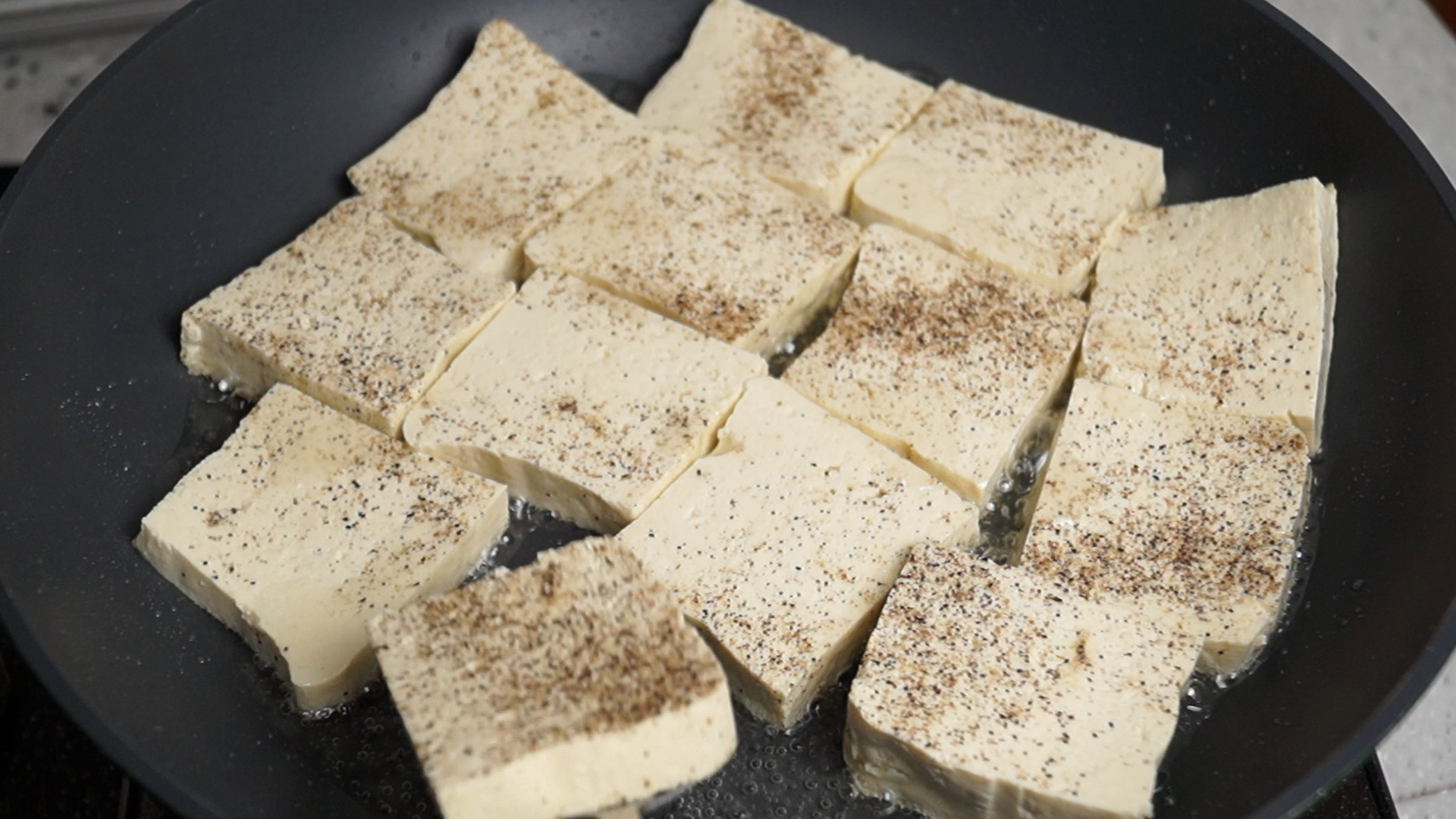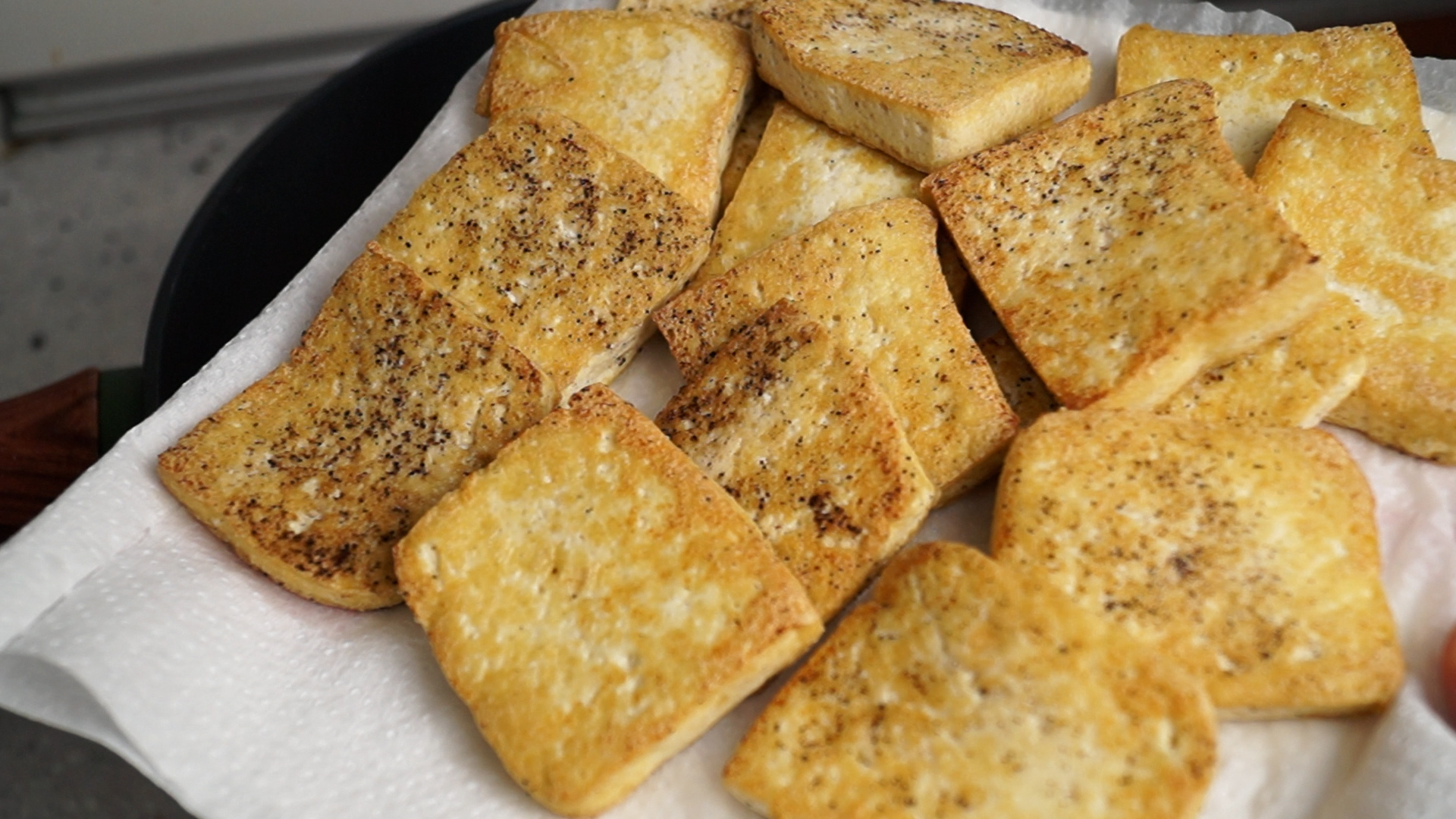 17. 노릇하게 구운 두부는 키친타월에 올려 기름기를 살짝 빼주세요. 사진에 검은건 탄게 아니라 후추가루에요.