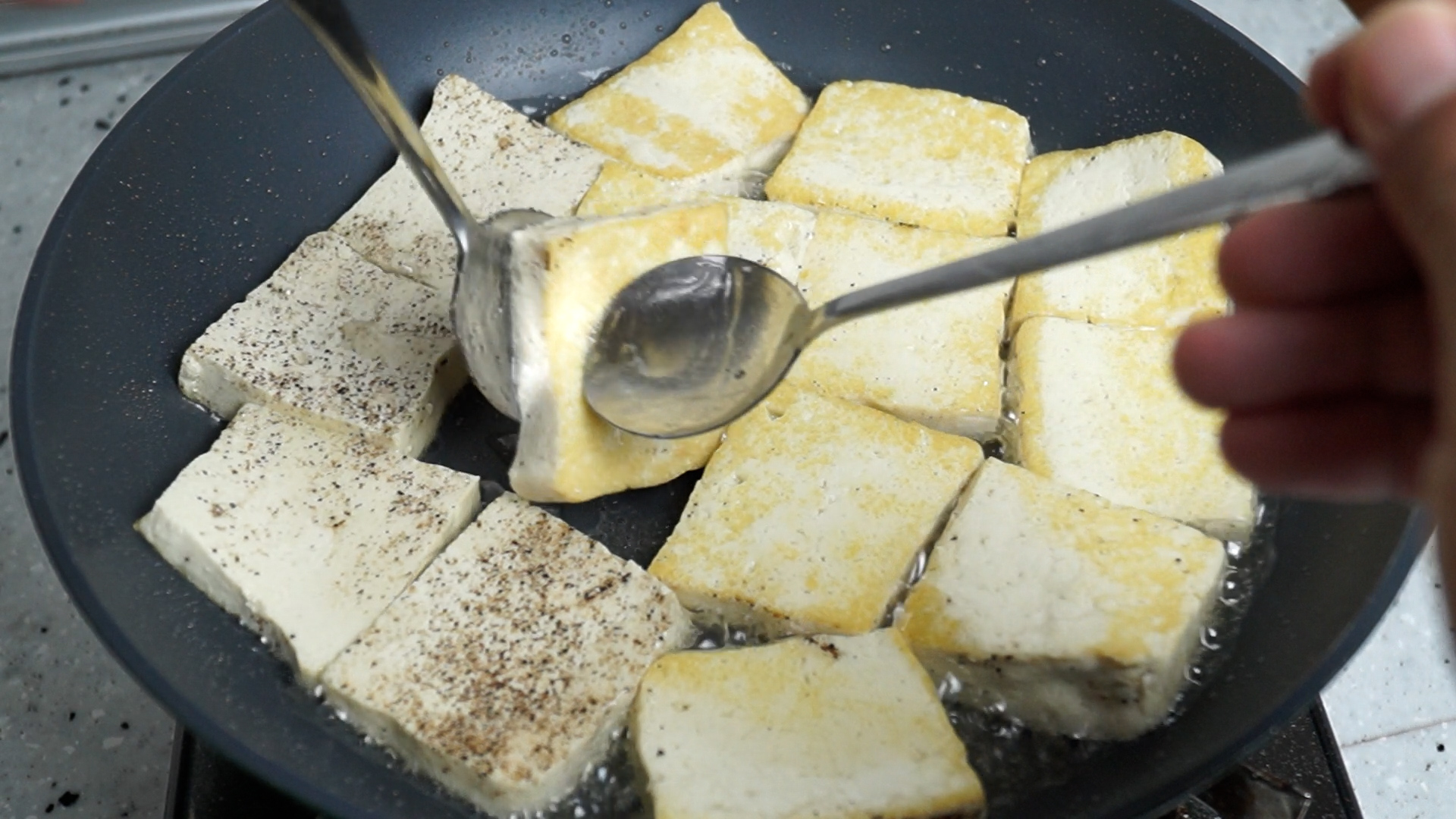 16. 2~3분에 한번씩 뒤집어가면서 앞뒤로 2~3차례 튀겨서 두부를 노릇하게 구워주세요.