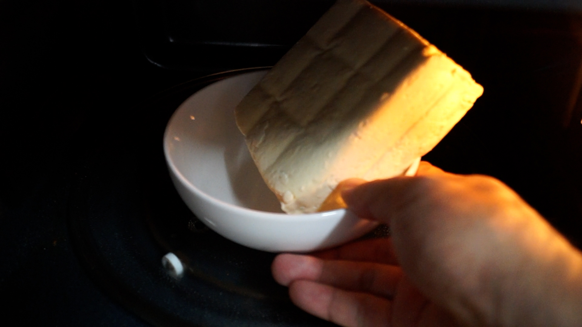 1. 단단한 부침용 두부 1모를 전자렌지에 넣고 2~3분 돌려서 수분을 빼주세요. 두부는 판매처 마다 무게가 300~600g 으로 다양한데 제가 사용한 두부는 500g 짜리 두부였습니다.