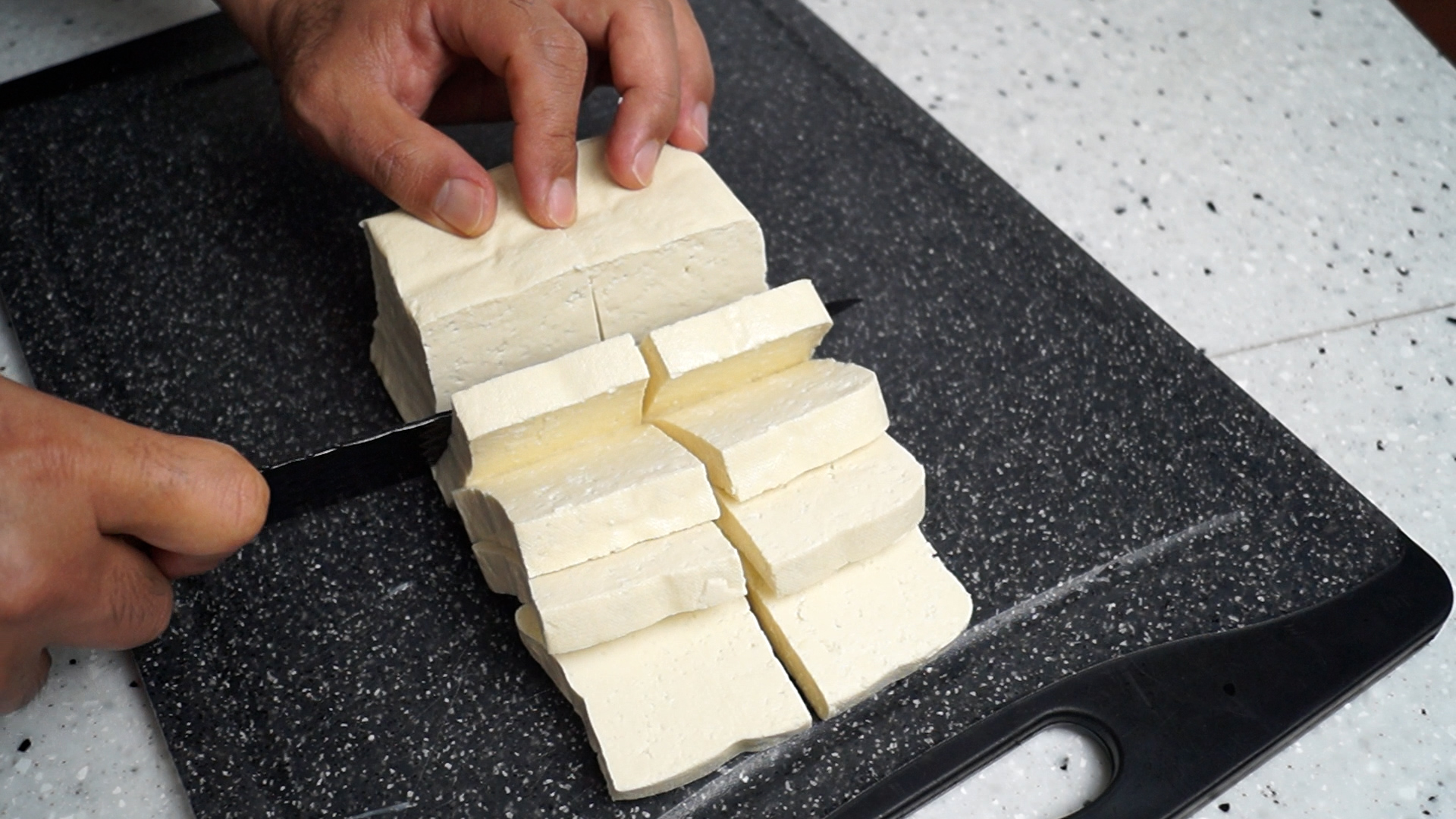 4. 두부를 반으로 자른 다음 1.5cm 정도 두께로 잘라주세요. 기호에 따라 반말고 3등분으로 잘라주고 1.5cm 두께로 써셔도 됩니다.