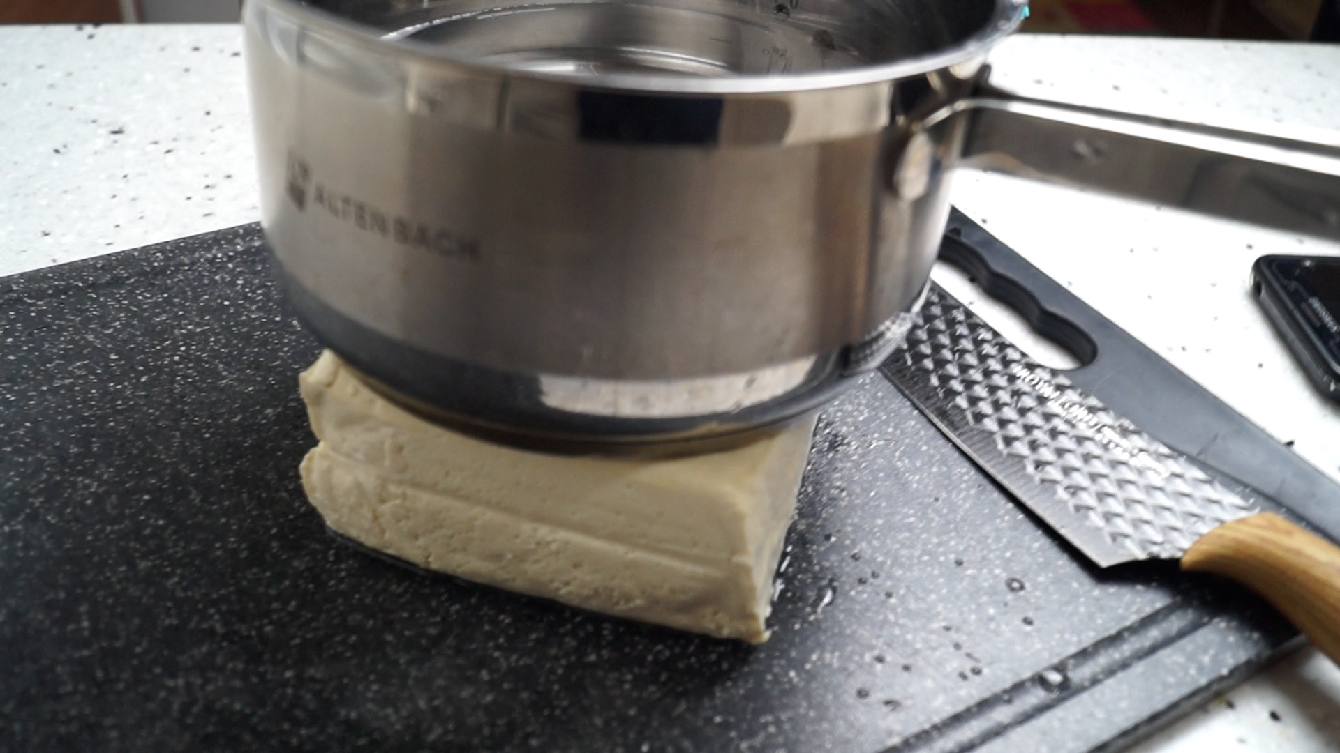 2. 혹시 전자렌지가 없으시거나 잘 안쓰시면 냄비에 물 1리터 정도 받아서 두부위에 10분 정도 올려 놓으면 두부가 눌려 물기가 빠져 나옵니다.