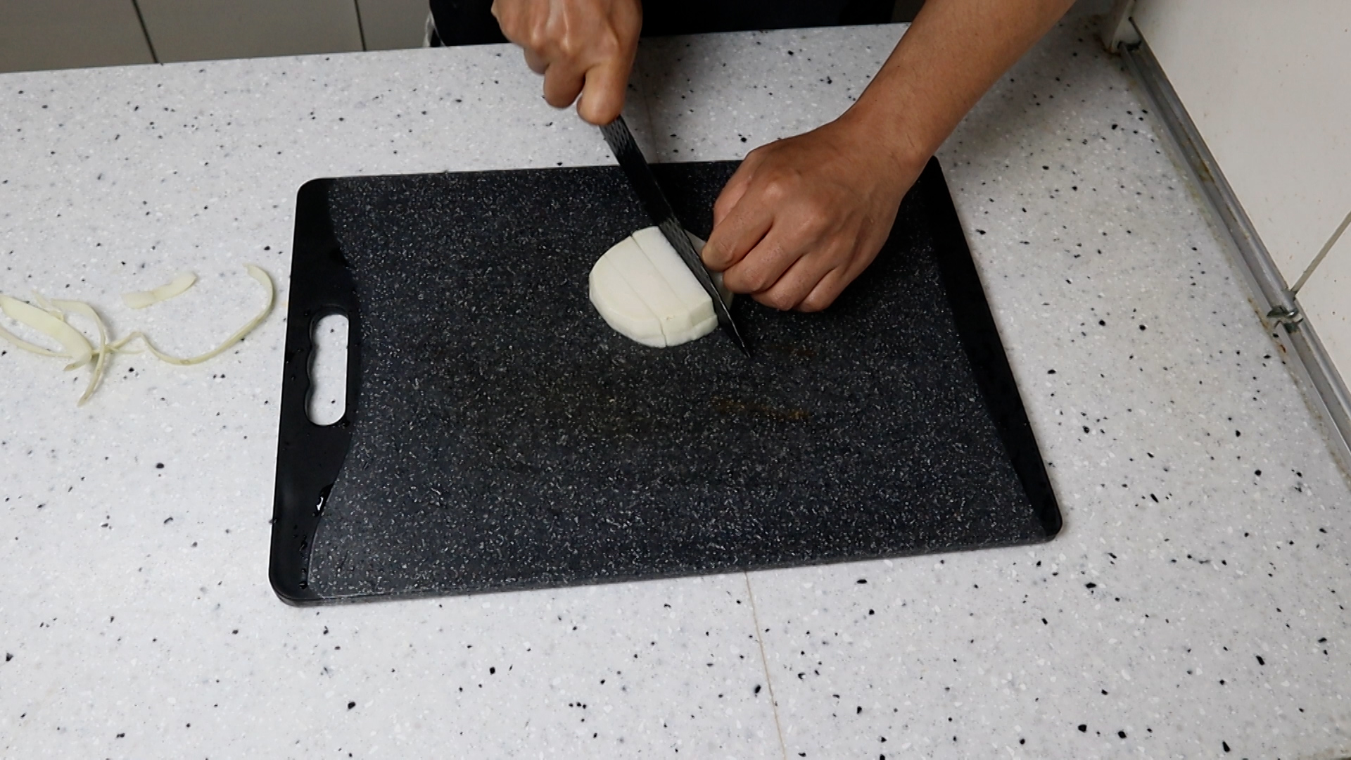 1. 무우를 0.5cm 두께로 2~3조각을 잘라주시고 길이방향으로 4등분으로 잘라주세요.