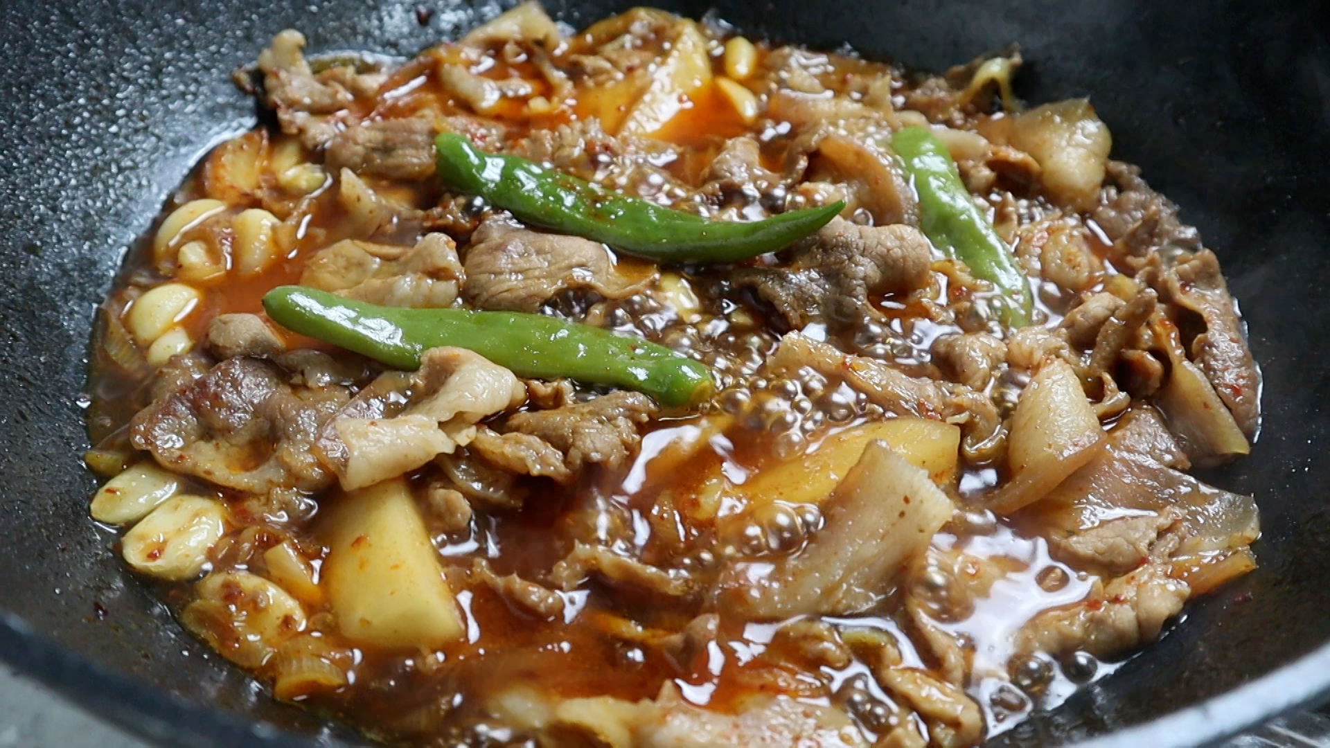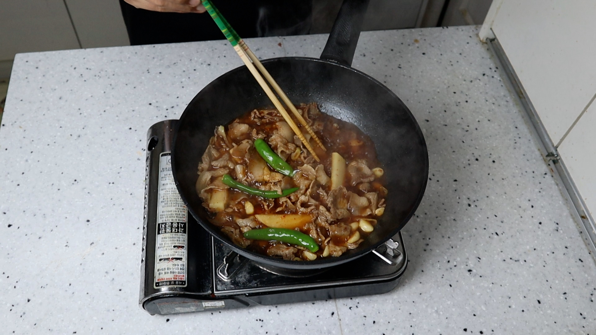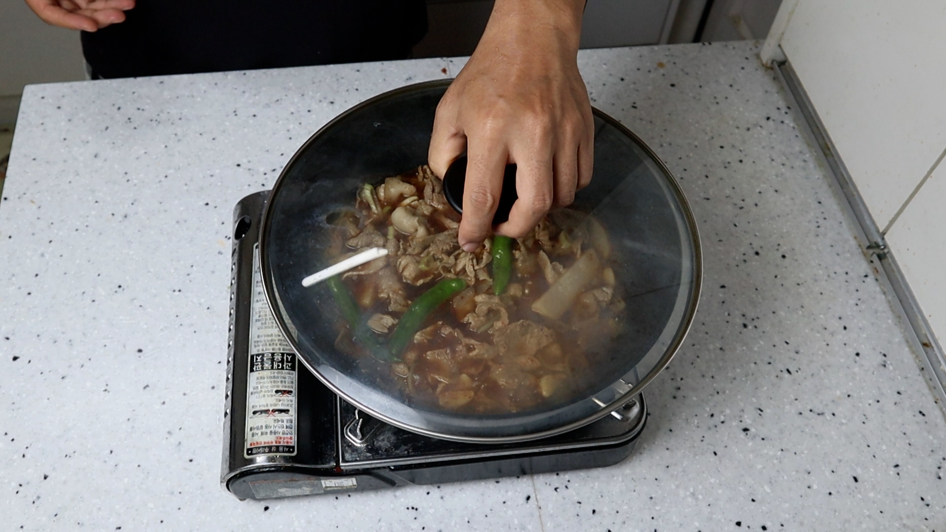 14. 고추를 넣고 불을 중약불로 줄이고 뚜껑을 덮고 9분 정도 가만히 두세요.