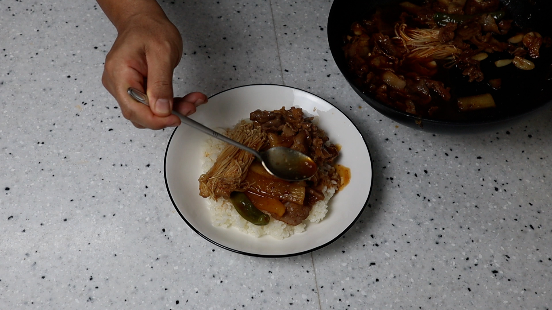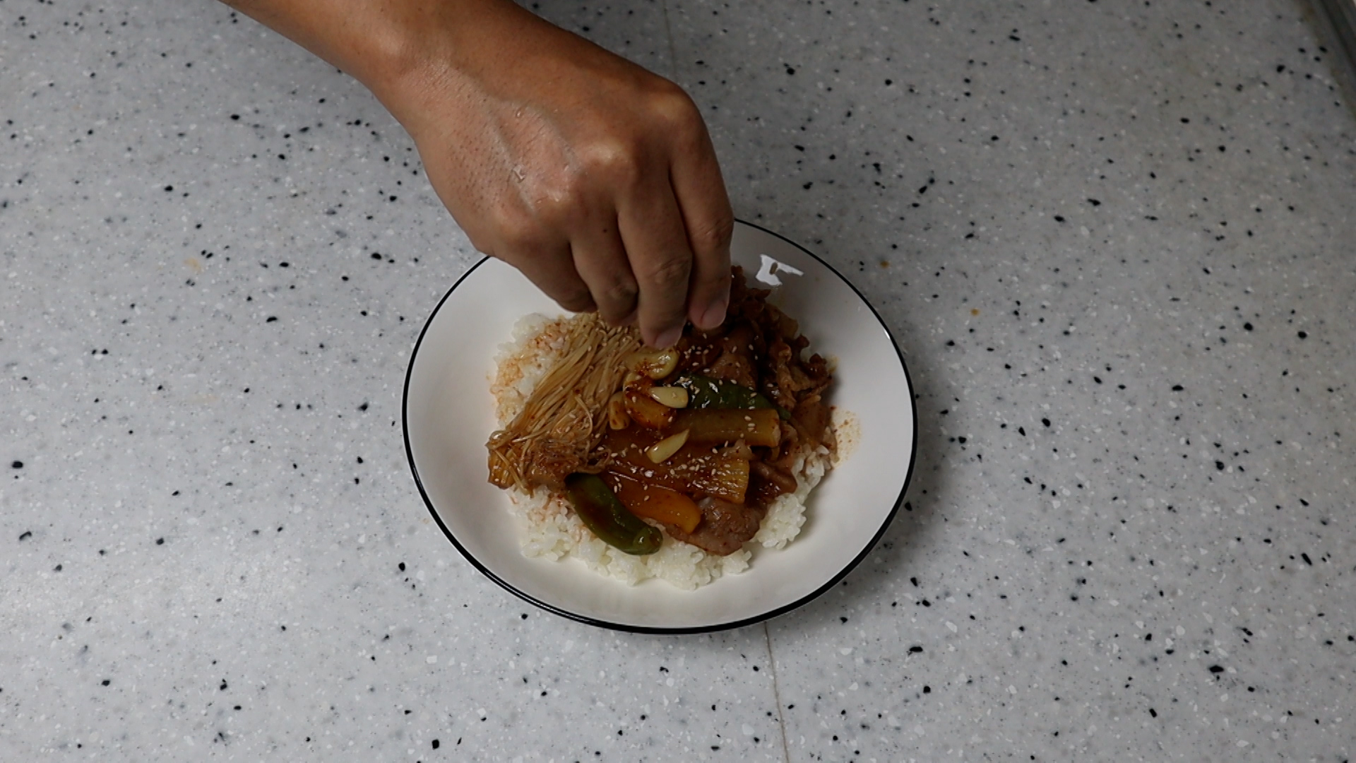 18. 밥 1공기에 고기 무우 버섯 고추 마늘 적당히 올리고 양념을 3~4스푼 끼얹어주세요.