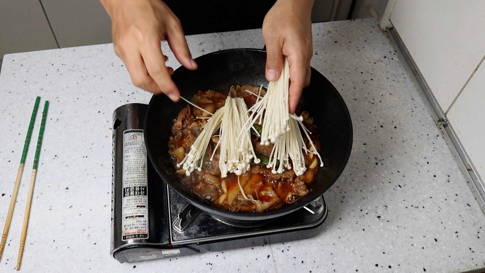 16. 9분후에 양념이 1/3정도로 쫄았으면 버섯을 넣고 오래 끓일 필요 없이 국물에 적셔 주면서 1분 정도를 끓여서 버섯에 간장양념을 입혀주세요.