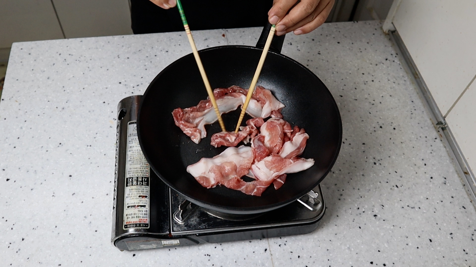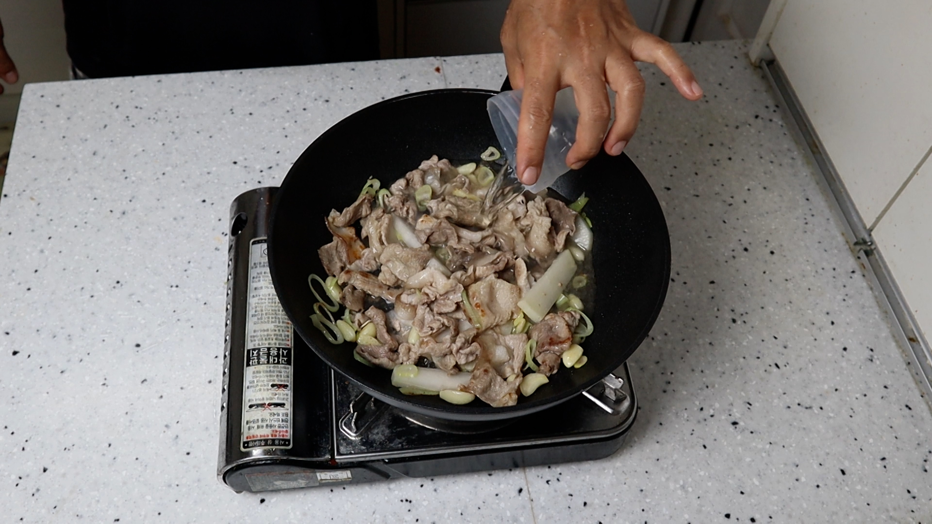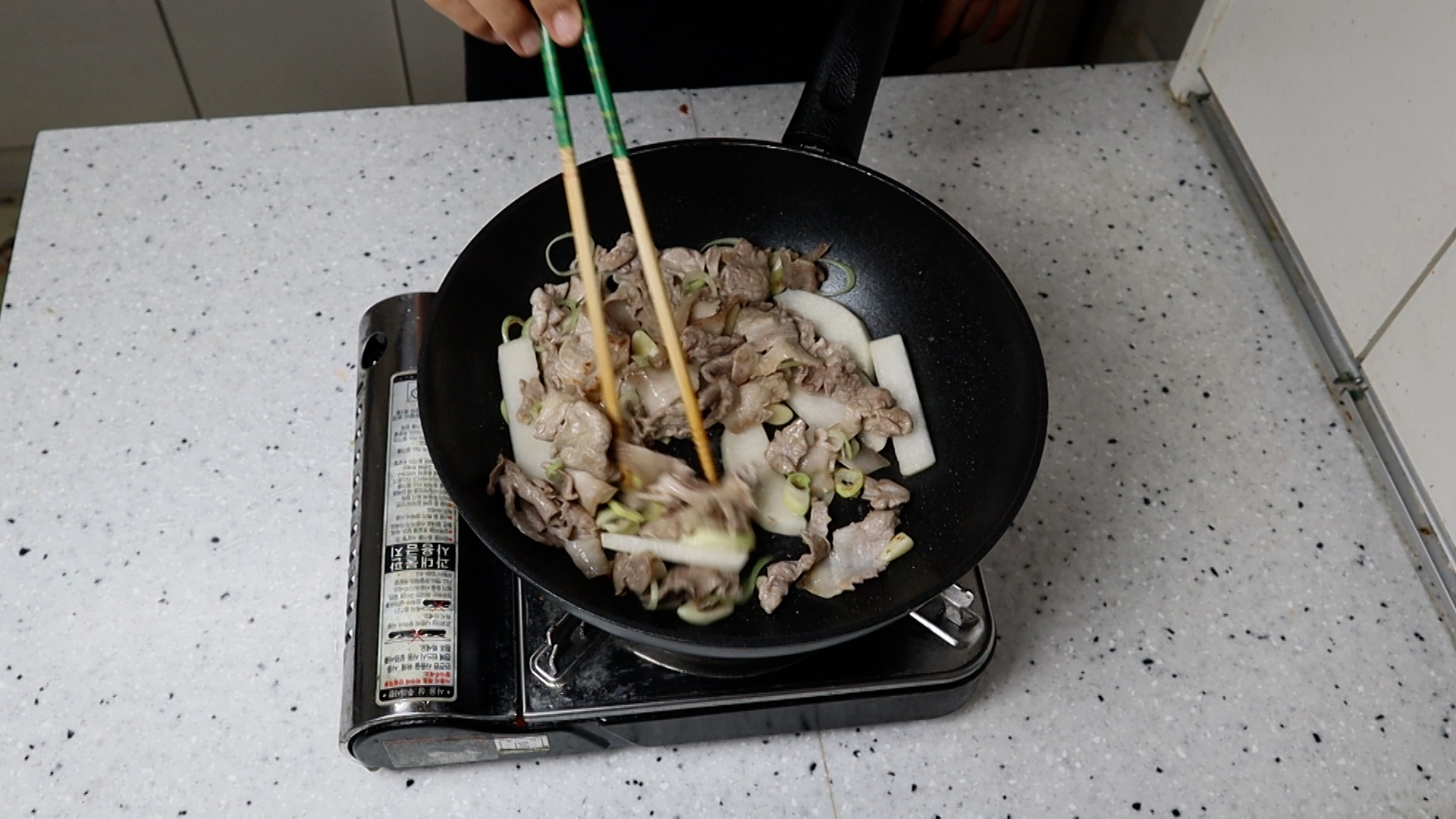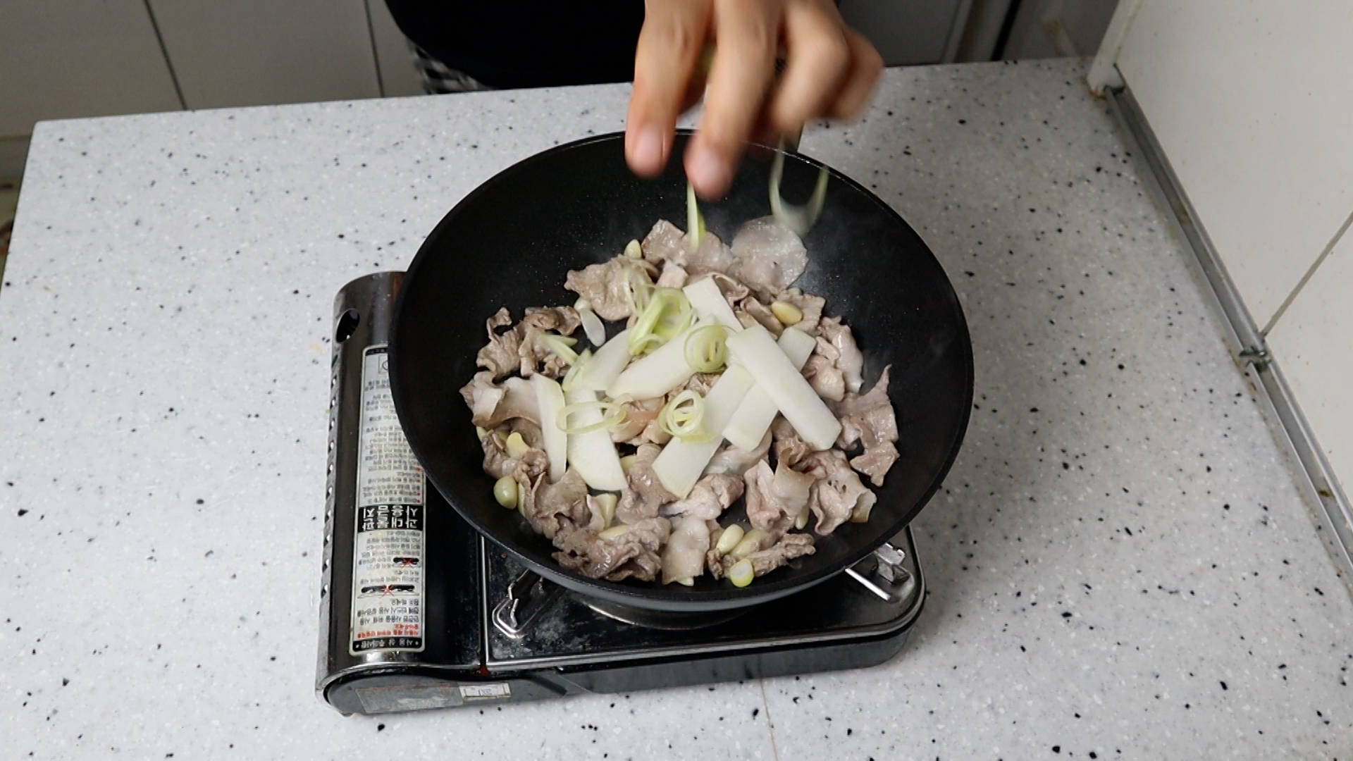 12. 볶은 고기에 무우와 대파를 넣고 강불유지하고 2분 정도를 볶아주세요.