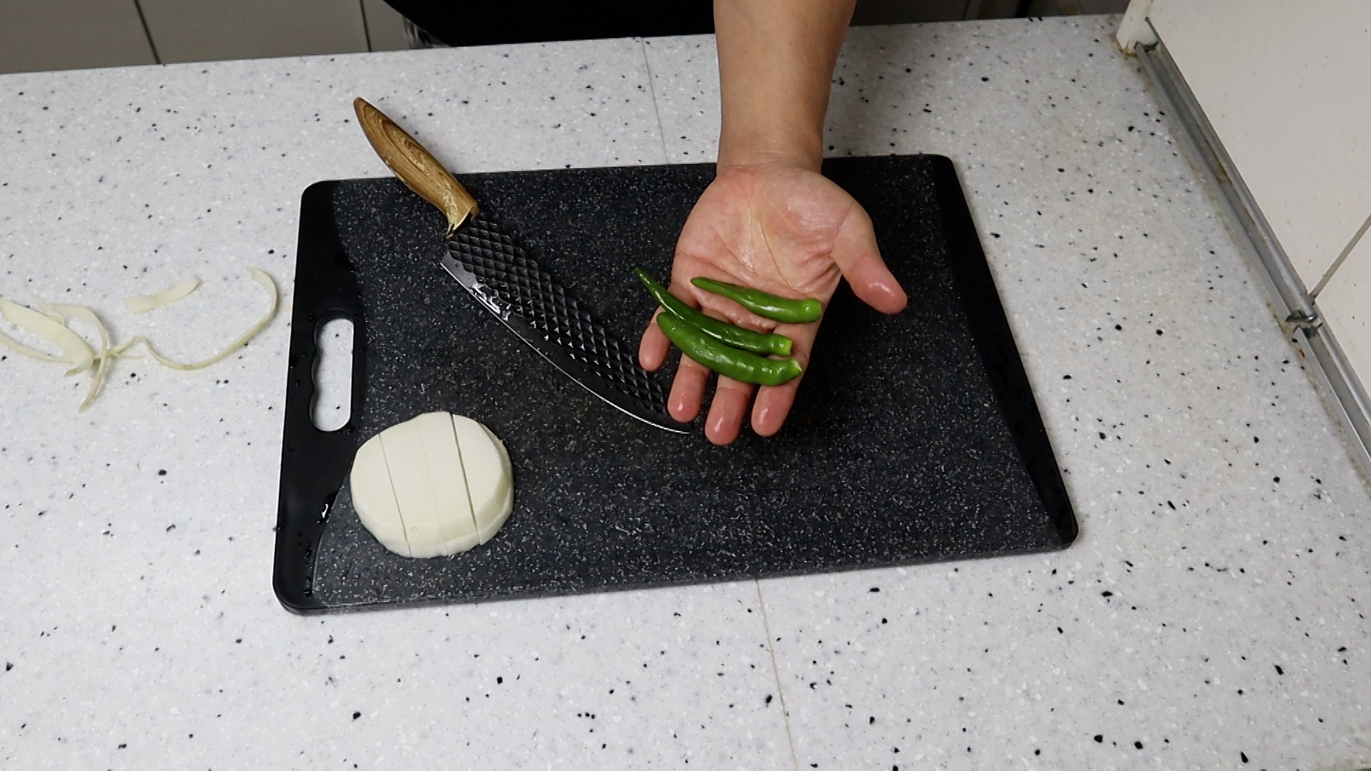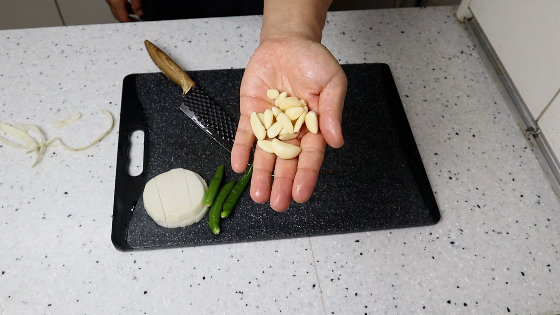 2. 청양고추 3개를 준비하시고 마늘은 통마늘 5개를 편으로 썰어 준비하셔도 되고 구이용이로 나오는 자잘한 마늘을 1주먹 가볍게 쥐어 준비해보세요.