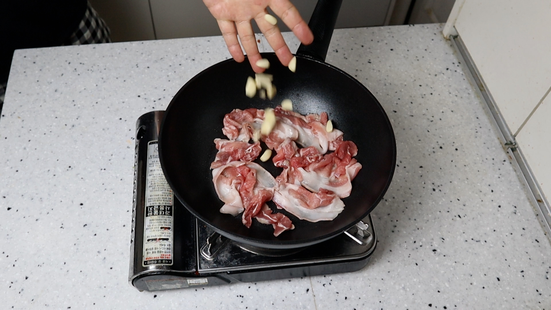 10. 고기는 돼지고기 앞다리살로 2~3mm 로 얇게 썰어나오는 제육용고기를 사용하시고 고기가 뭉쳐서 구워지지않게 골고루 펼쳐주시는게 좋습니다. 마늘을 고기를 넣은 직후 바로 넣어주세요.