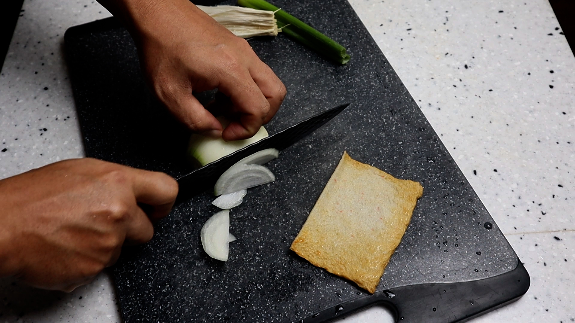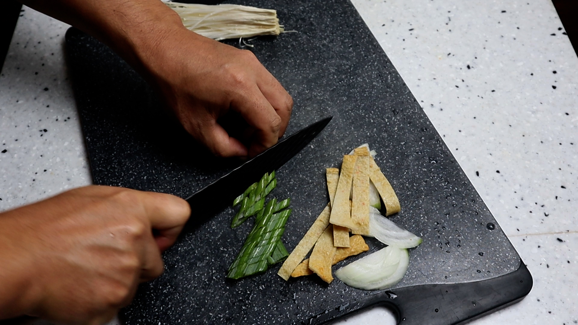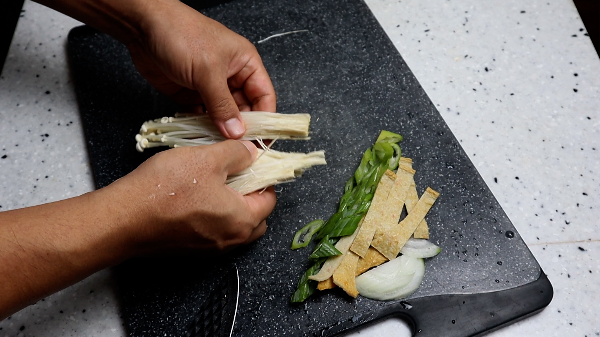 8. 토핑이 있으면 더욱 맛있습니다! 저는 양파, 어묵, 팽이버섯, 대파를 재료 란에 적힌 분량껏 준비했습니다. 어묵 대신 새우 2마리 오징어 한줌 정도 넣으면 국물이 더욱 맛있습니다.