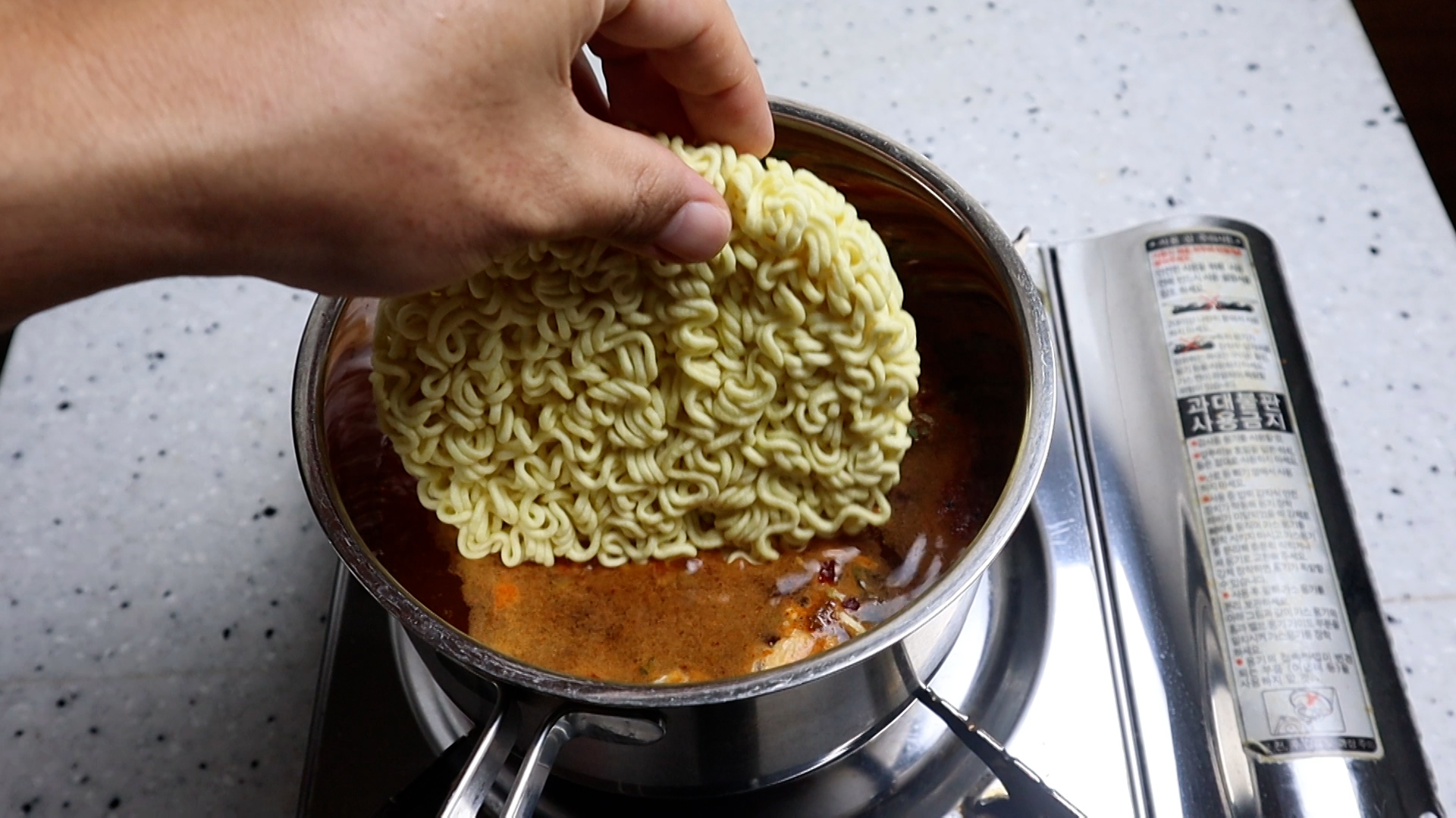 11. 물이 끓으면 라면을 넣고 오늘의 핵심! 아까 만든 양념장을 1스푼 적당히 넣어주세요. 양념 들어간다고 물을 늘일 필요 없습니다.