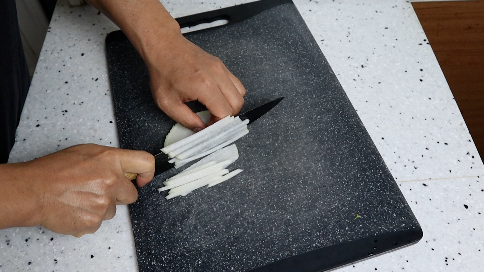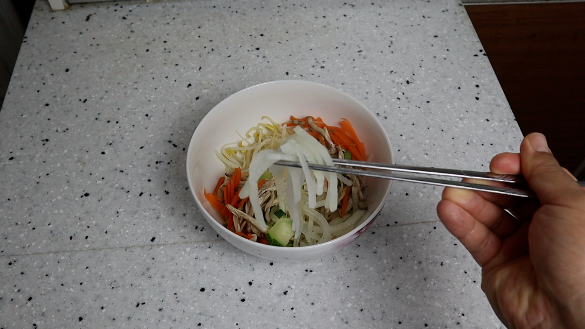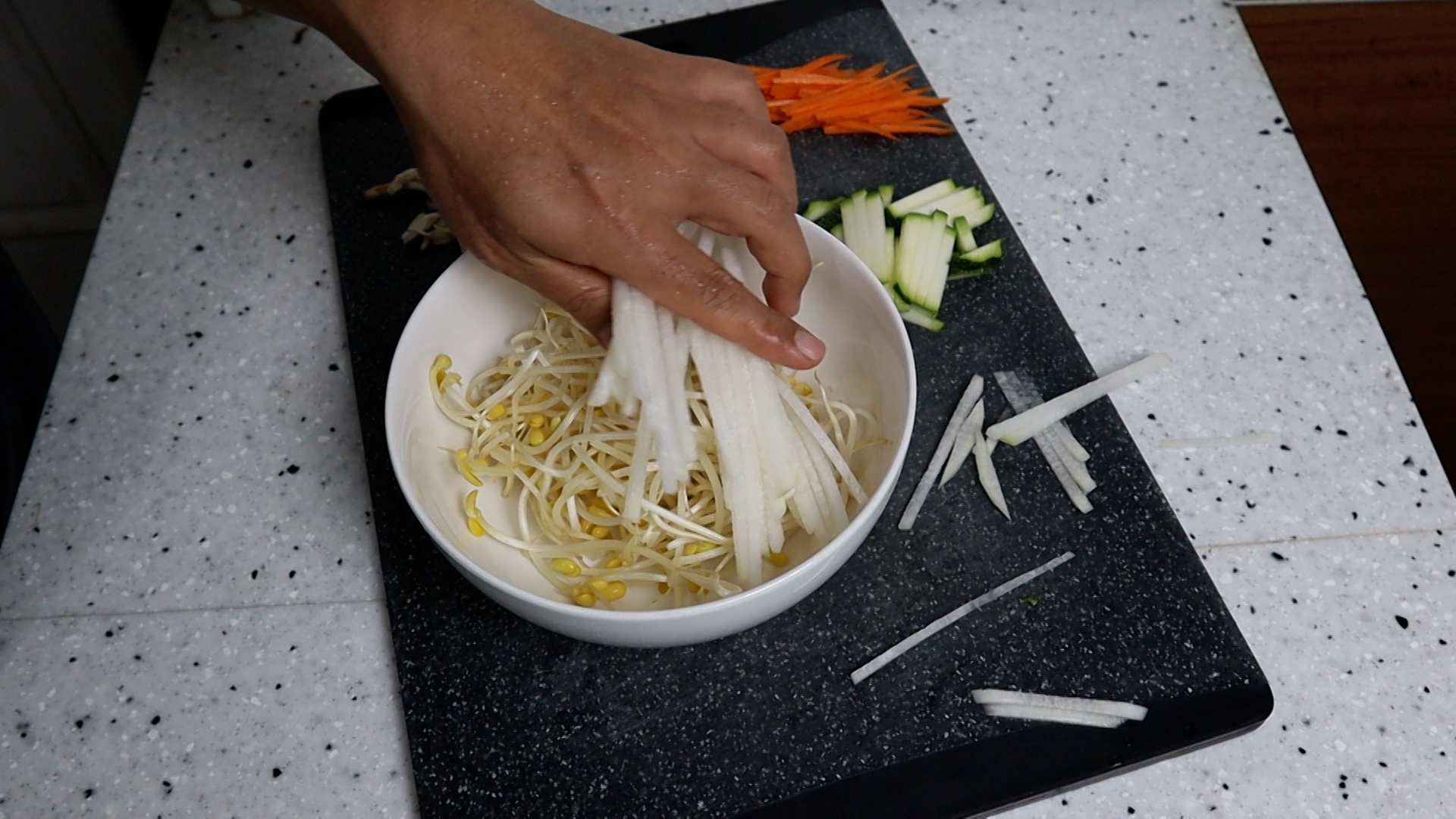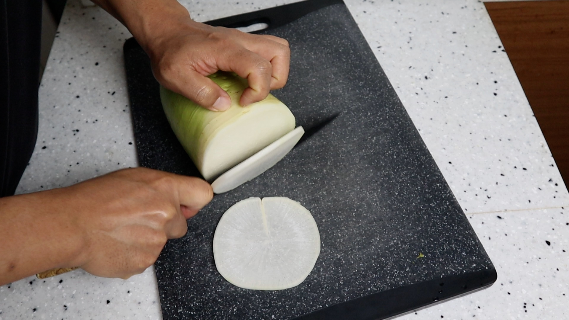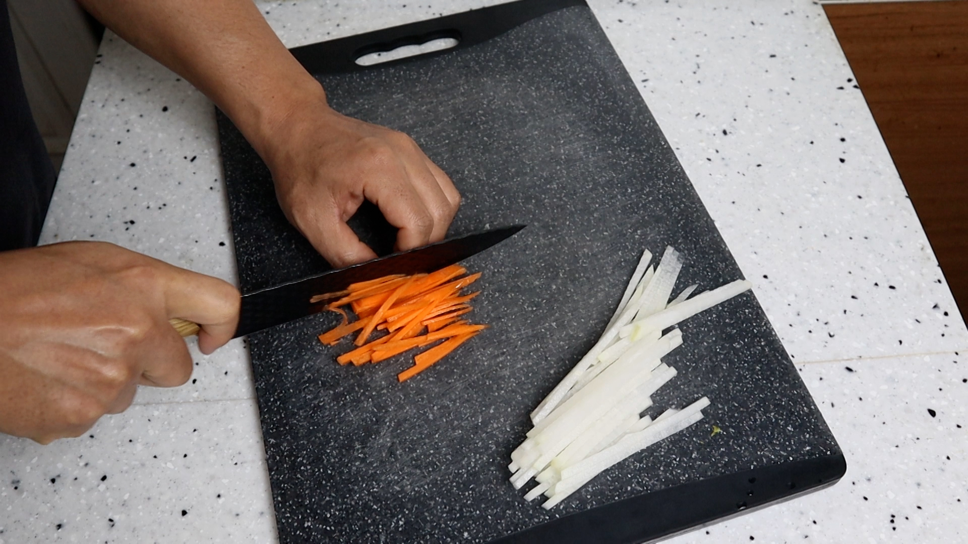 1. 오늘 만들 재료는 2인분 기준입니다. 무우를 3~4mm 두께로 2조각을 잘라서 채를 썰어주세요. 좀더 얇은건 괜찮지만 두꺼우면 안됩니다.