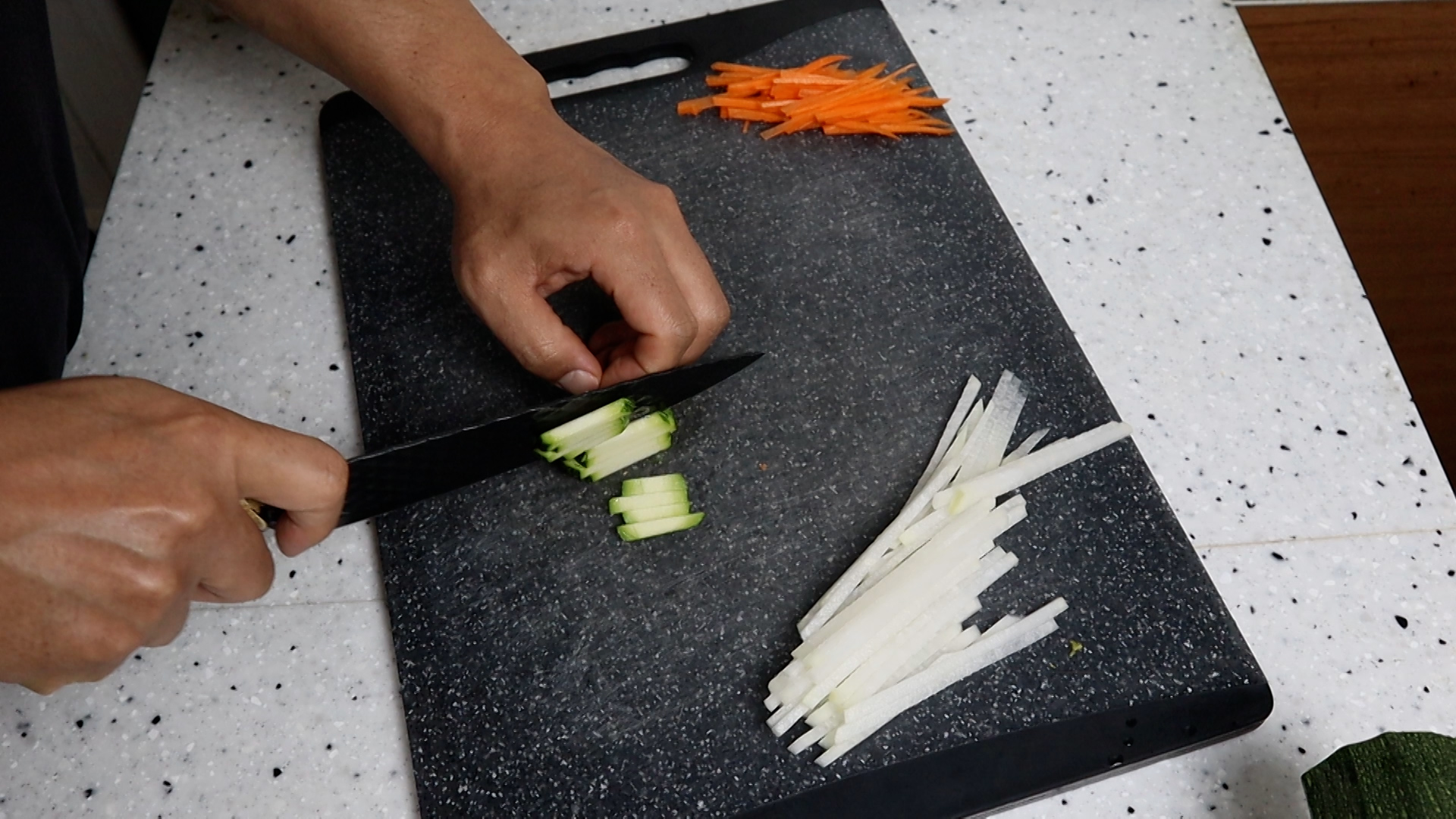2. 당근은 2~3mm 두께로 채를 썰고 호박은 0.5cm 두께로 4조각 썰어서 길이방향도 0.5cm 로 채를 썰어주세요.