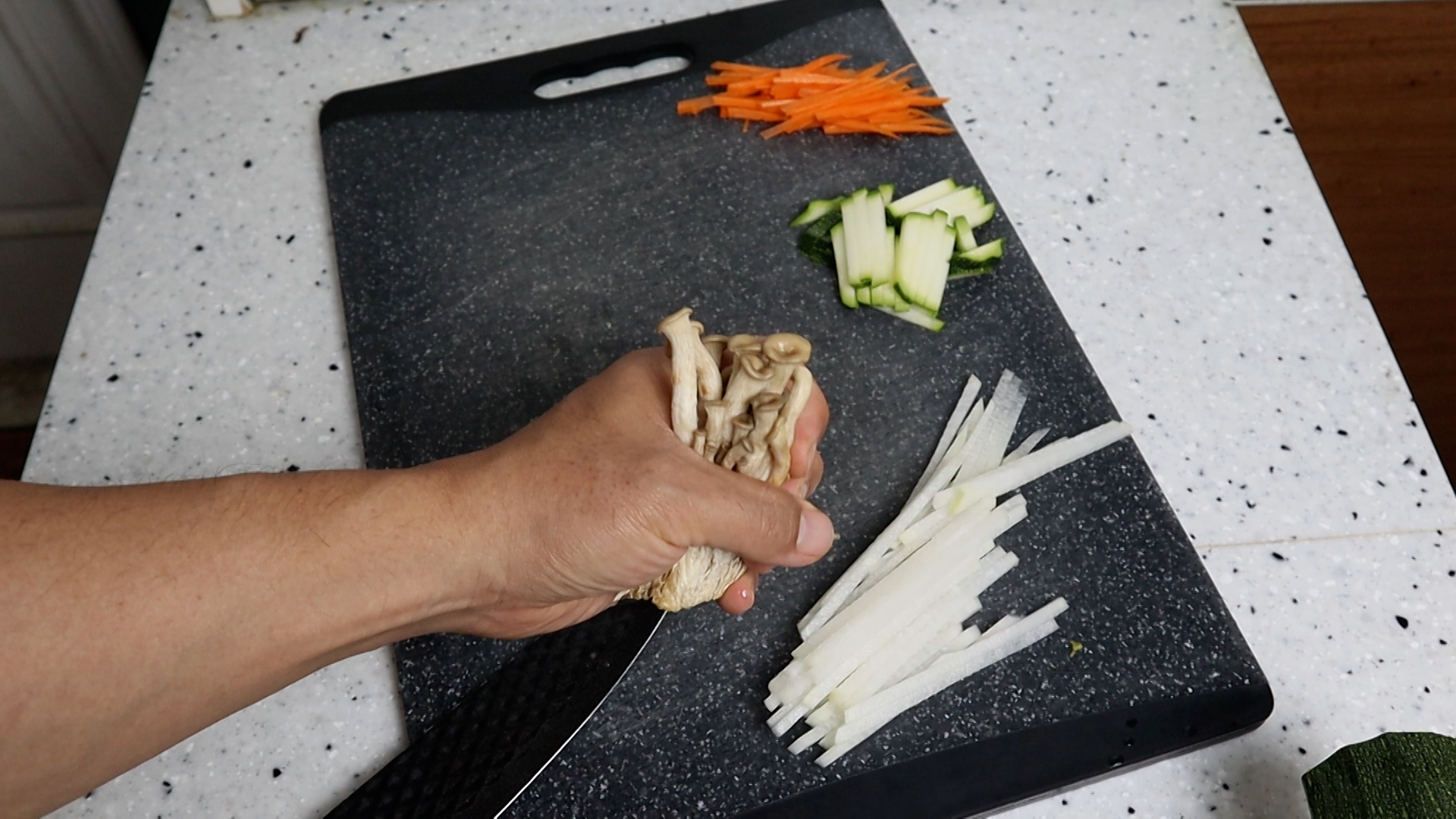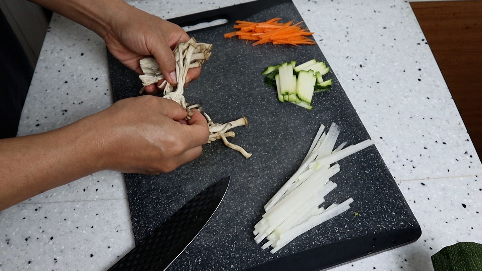 3. 느타리버섯은 주먹으로 가볍게 쥐어지는 양을 준비해서 죽죽 찢어서 준비해주세요.
