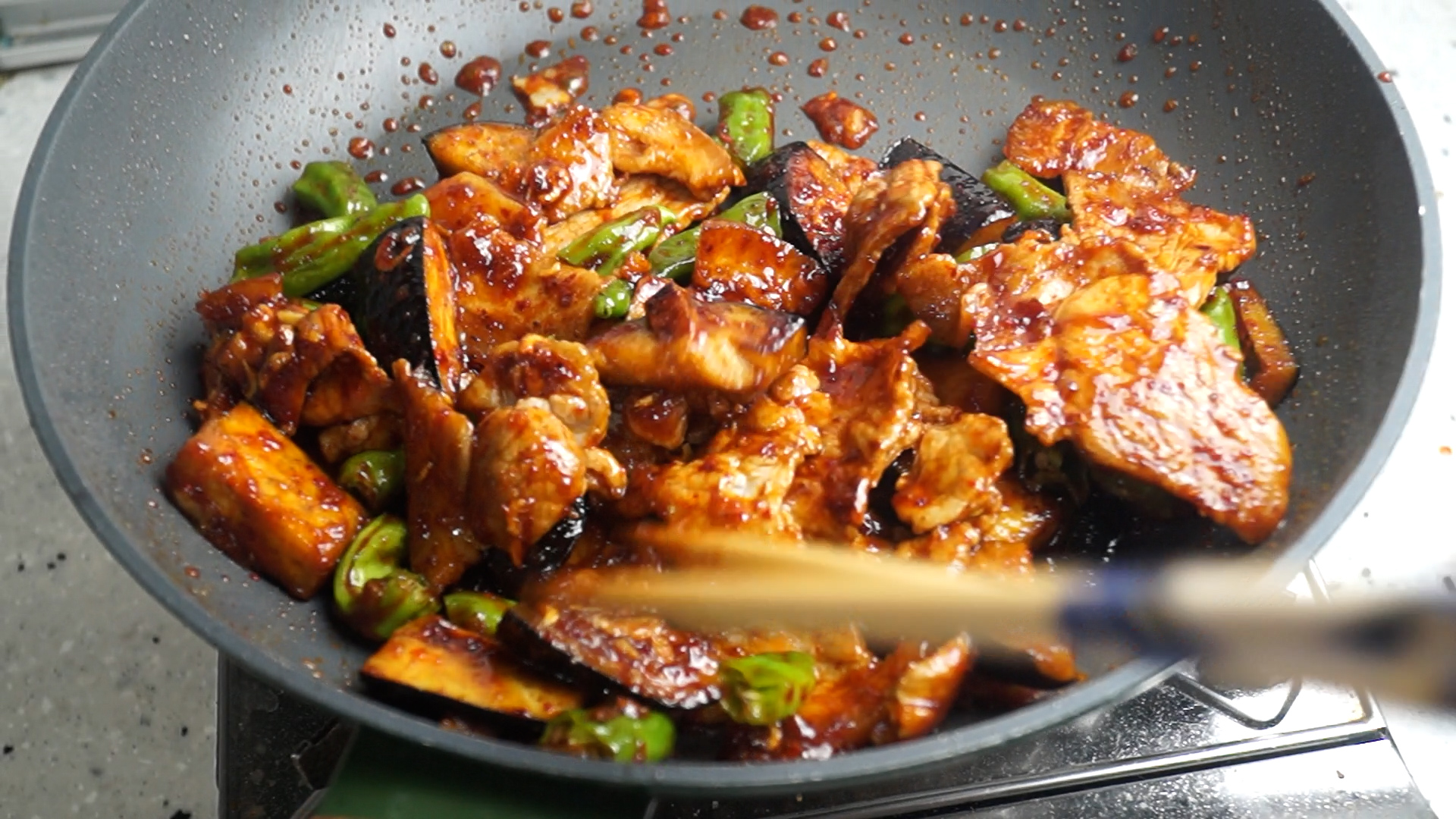 16. 꽈리고추를 넣고 강불 유지하고 30~40초 정도만 볶아주세요. 너무 오래볶으면 가지는 물러지고 꽈리고추는 질겨질수 있으니 빠르게 볶아주세요.