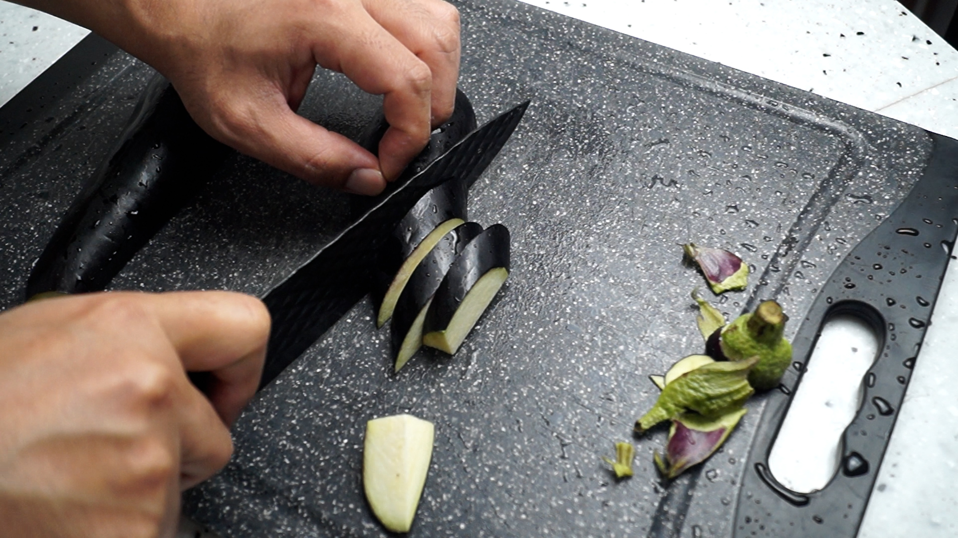2. 가지꼭지는 잘라주시고 가지를 대략 2cm 정도 드께가 나오게 썰어주세요. 너무 얇으면 흐물흐물 거릴수 있으니 두께감을 좀 주시는게 좋습니다.