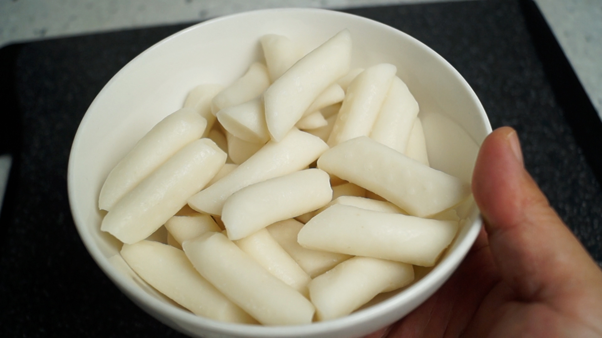 8. 끓는물에 떡을 3분 정도 삶아서 말랑말랑하게 만들어주세요. 너무 저렴한 떡은 삶아도 말랑해지지 않는 쌀떡도 있더라고요. 너무 저렴이 사지 않게 주의하세요^^