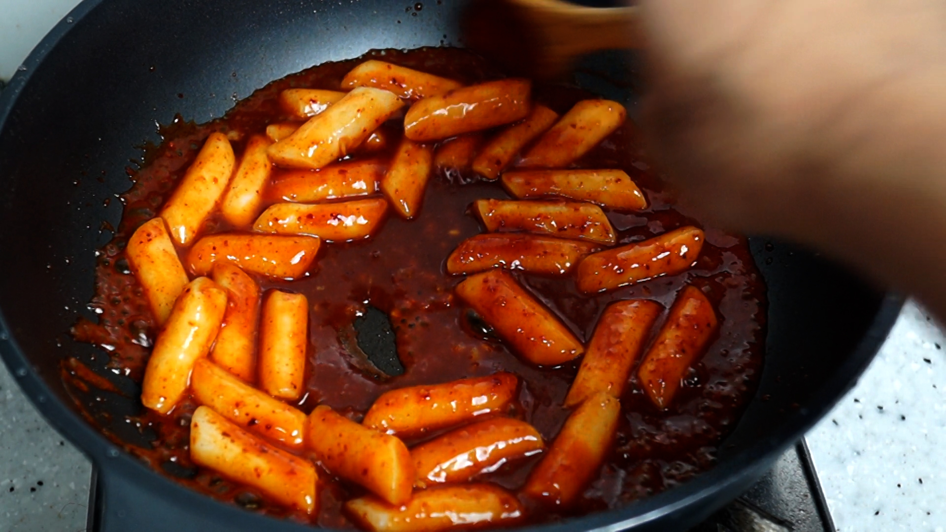 11. 중불에 양념을 자글자글 끓여가면서 떡과 함께 졸여주세요. 떡을 삶지 않고 기름에 튀겨서 사용하시면 겉바속촉!! 하게 즐기실수 있어요.