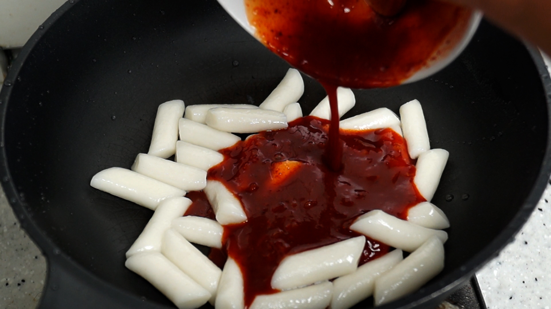 10. 코팅된 웍에 불린 떡을 넣고 양념을 전부 부어주세요.