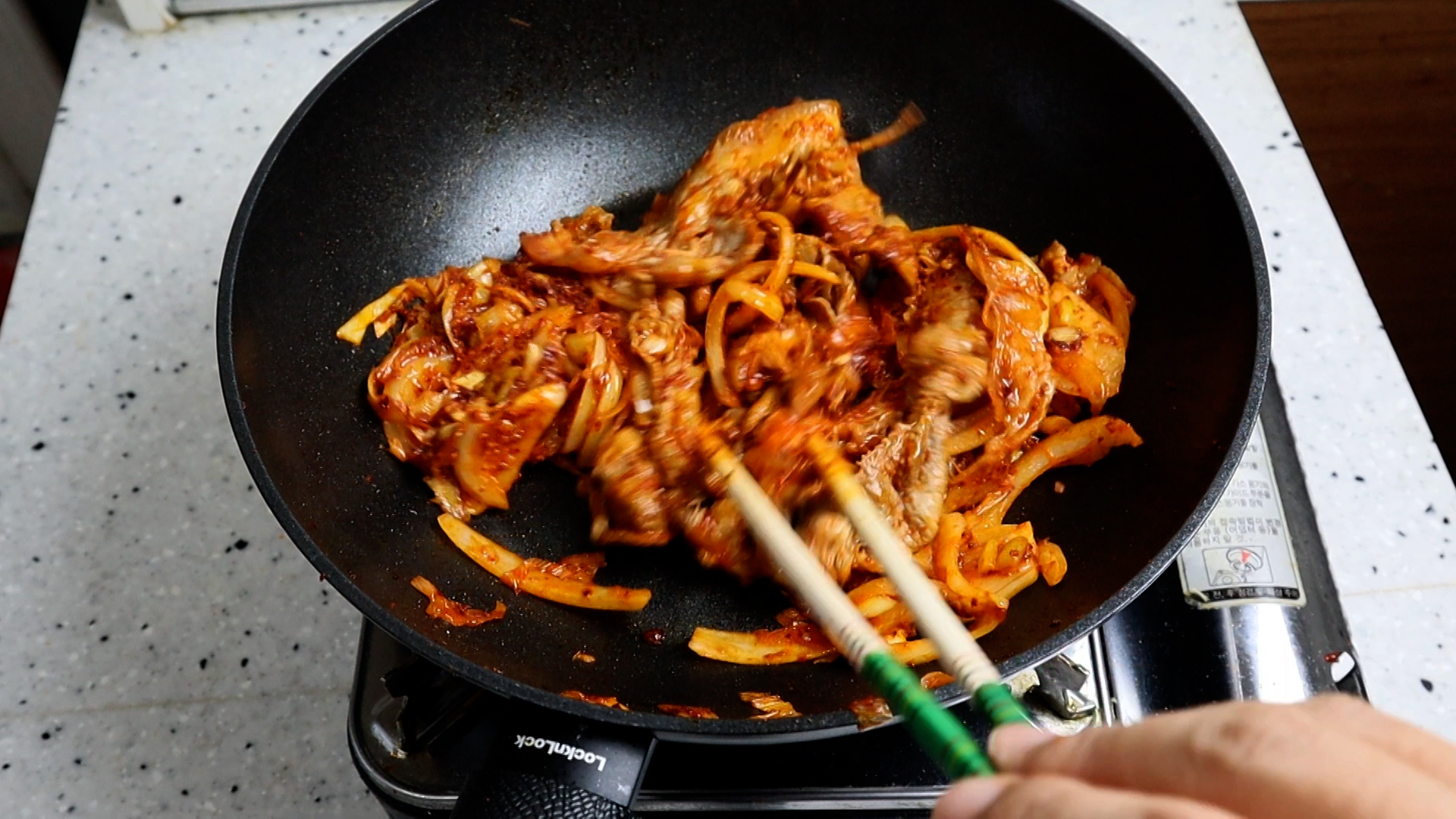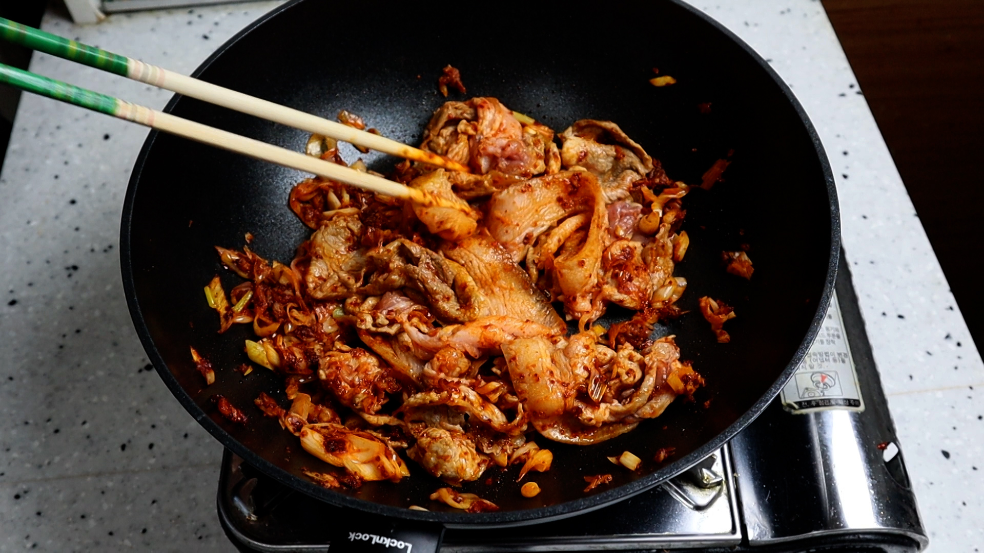 9. 고기넣고 불을 중약불로 바꾸고 1분 30초 정도 볶아주세요.