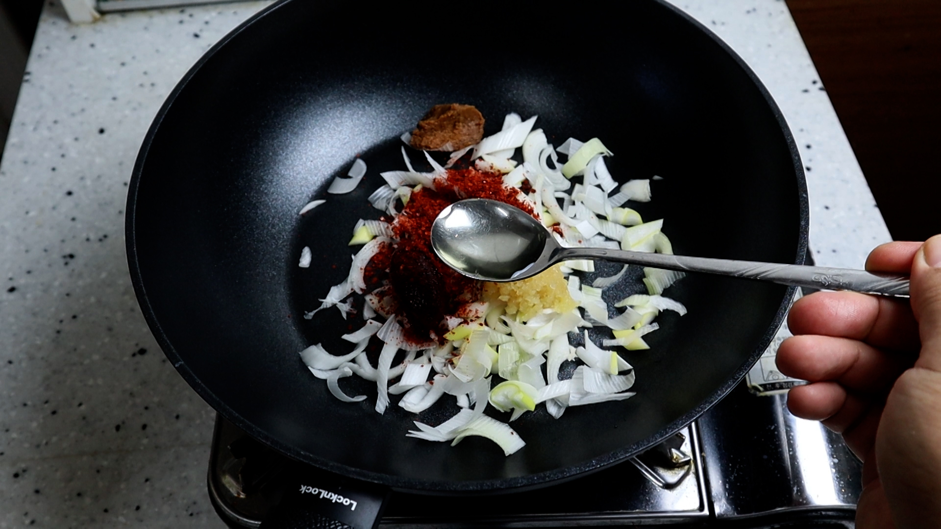 10. 양파를 넣고 불을 강불로 올리고 1분 30초 정도 볶아주세요.