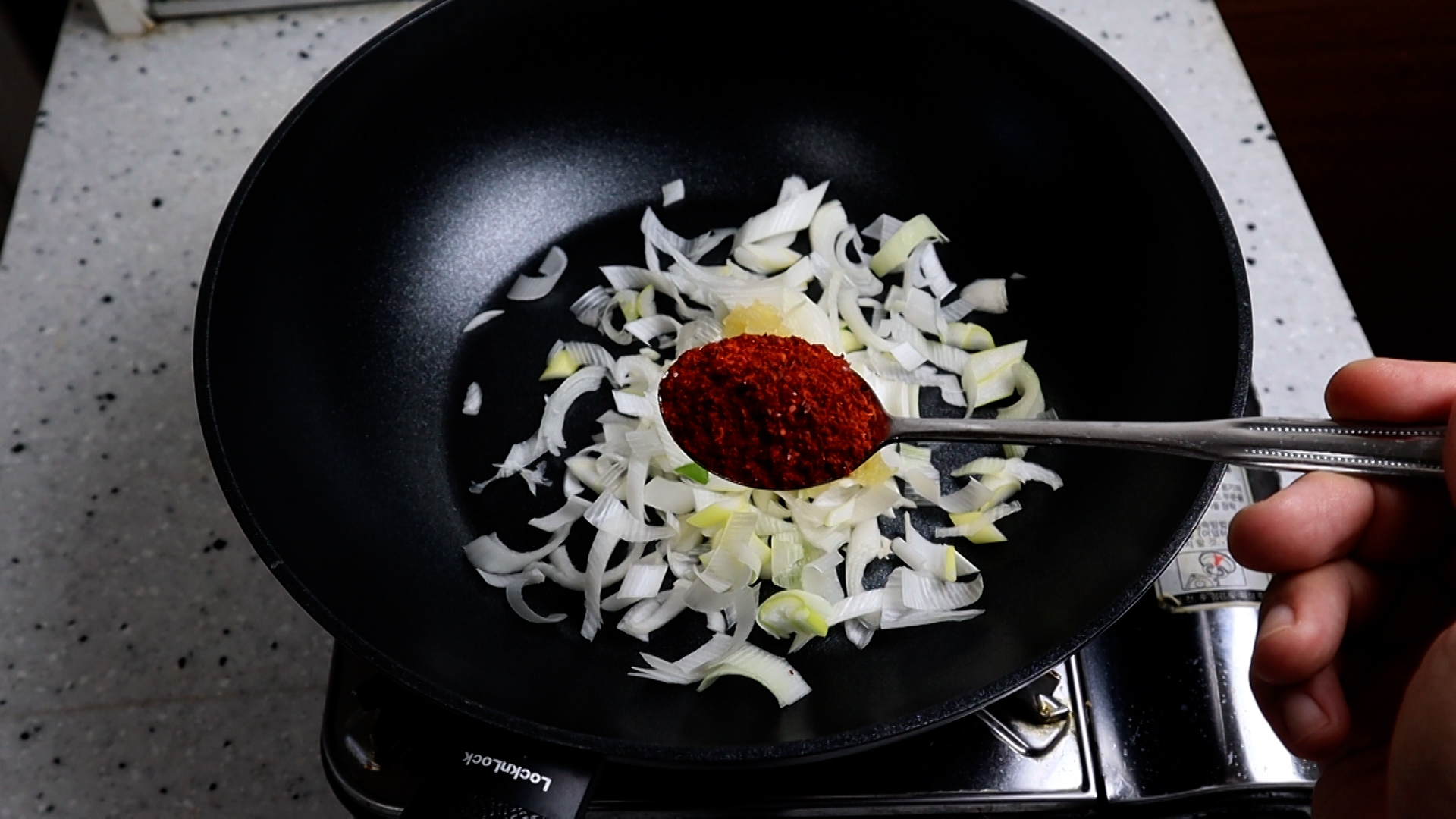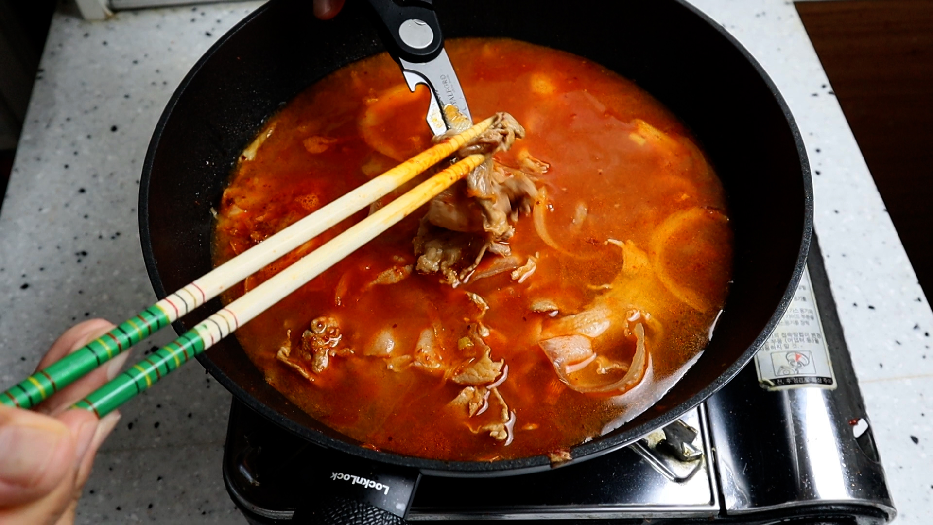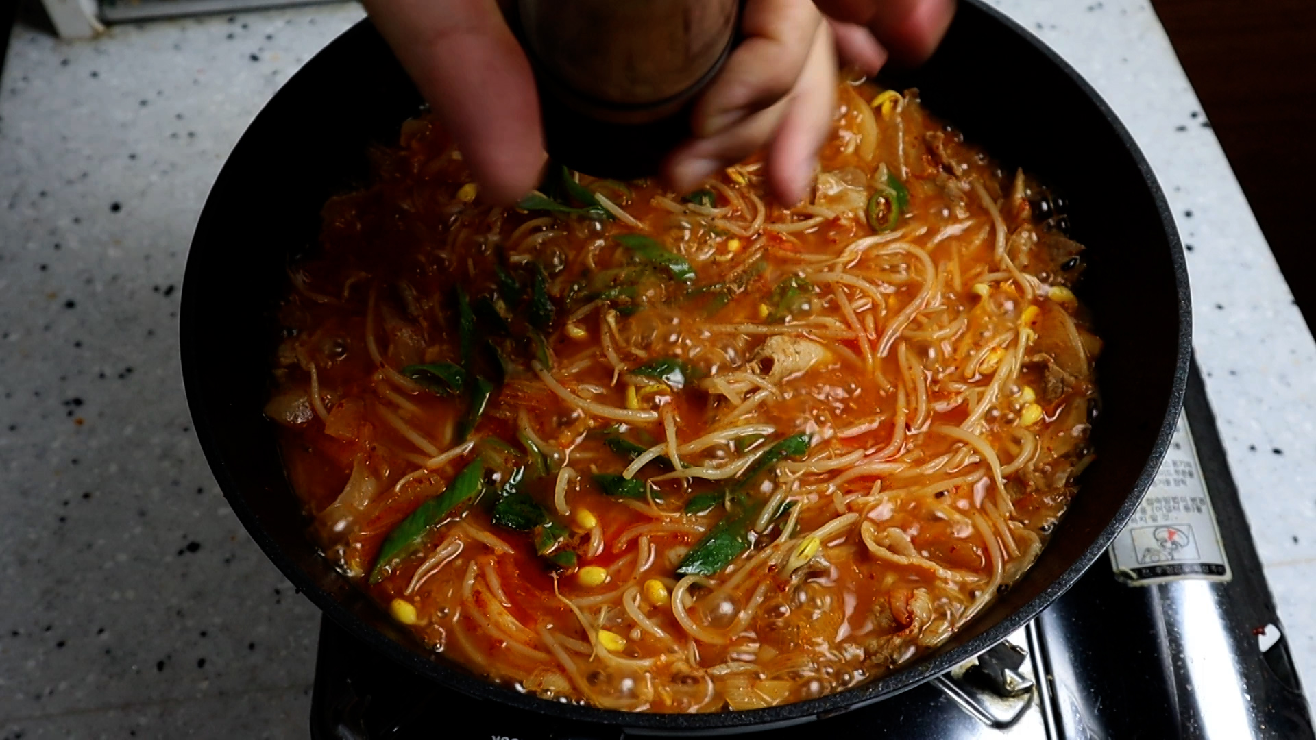 18. 잘라둔 땡초와 대파를 넣고 대략 1분 정도를 더 끓여주세요.