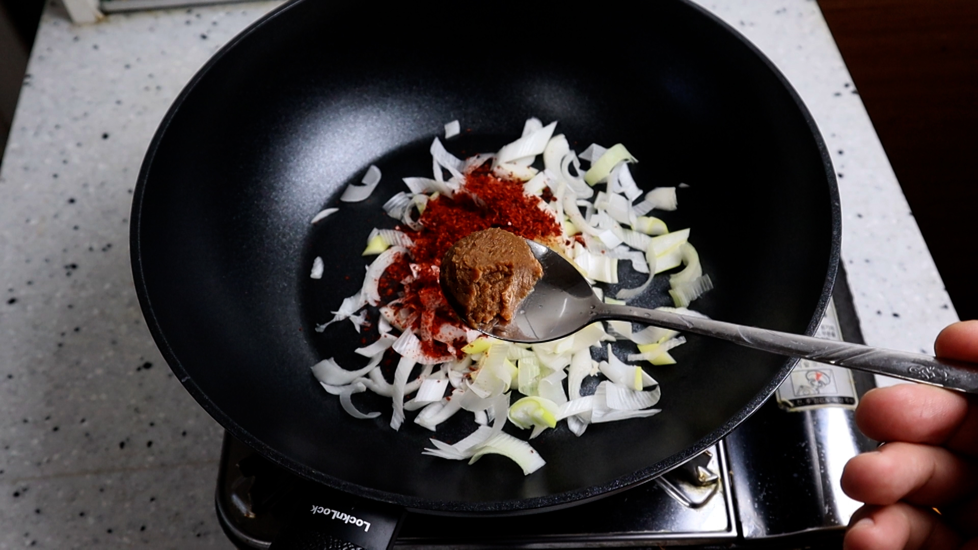 6. 찌개에 구수함과 깊은 맛을 더해줄 된장과 칼칼함과 국물에 녹진함을 더해줄 고추장을 넣어주세요.