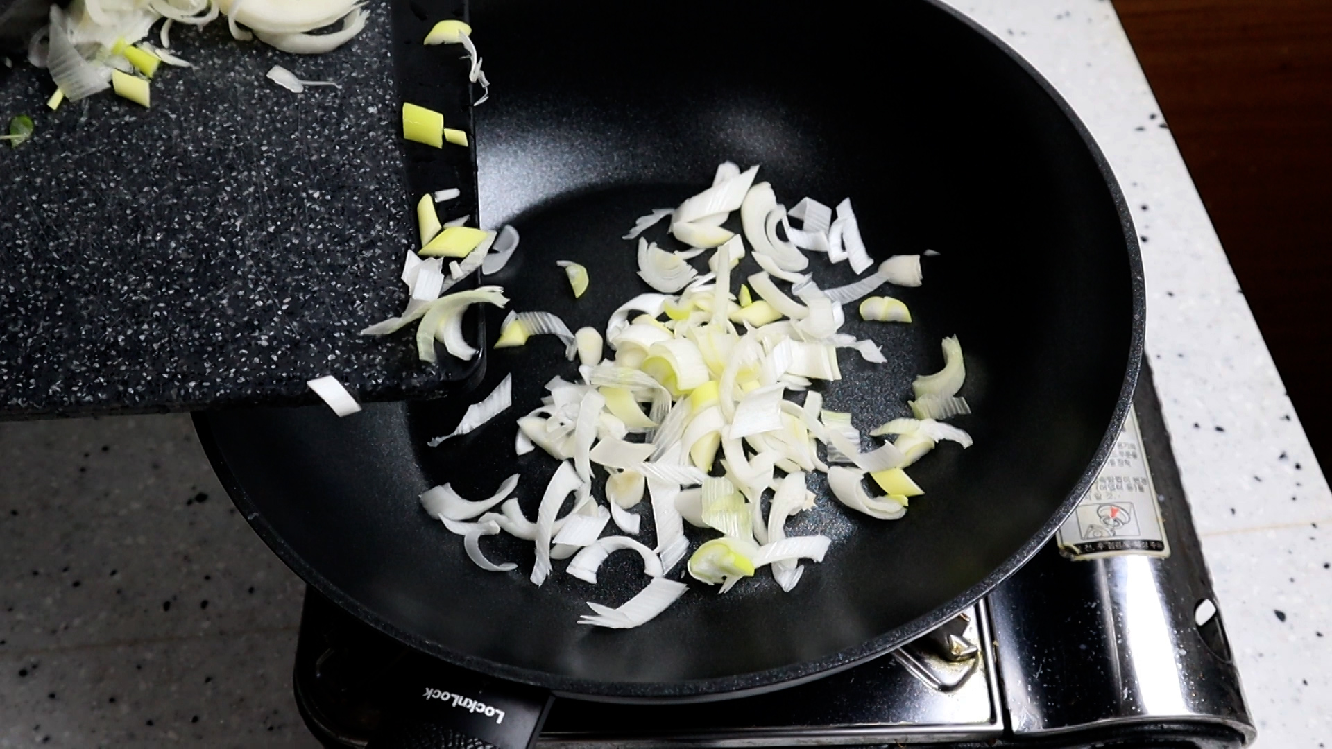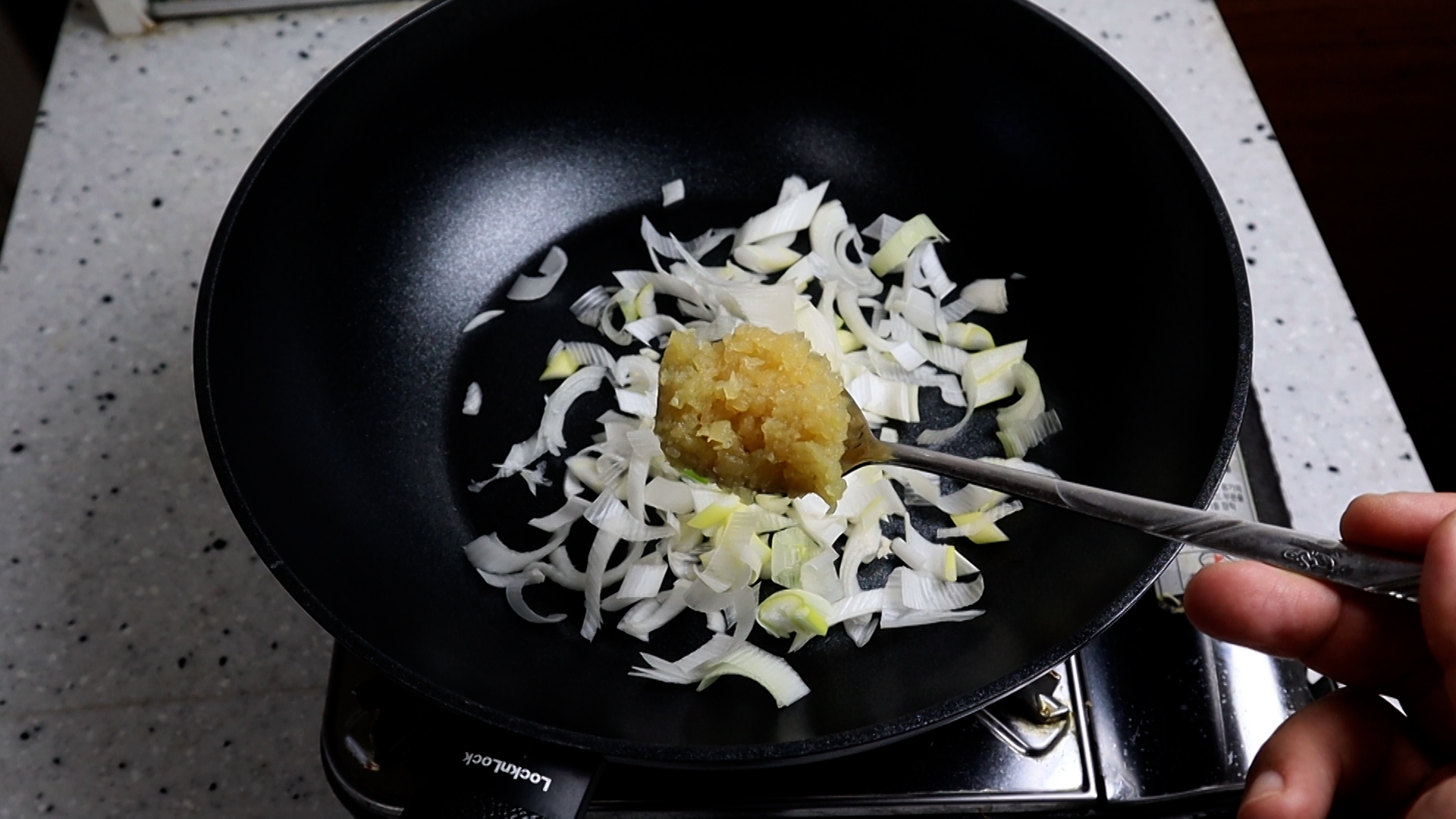 4. 웍에 대파 흰대를 넣고 간마늘을 넣어주세요.