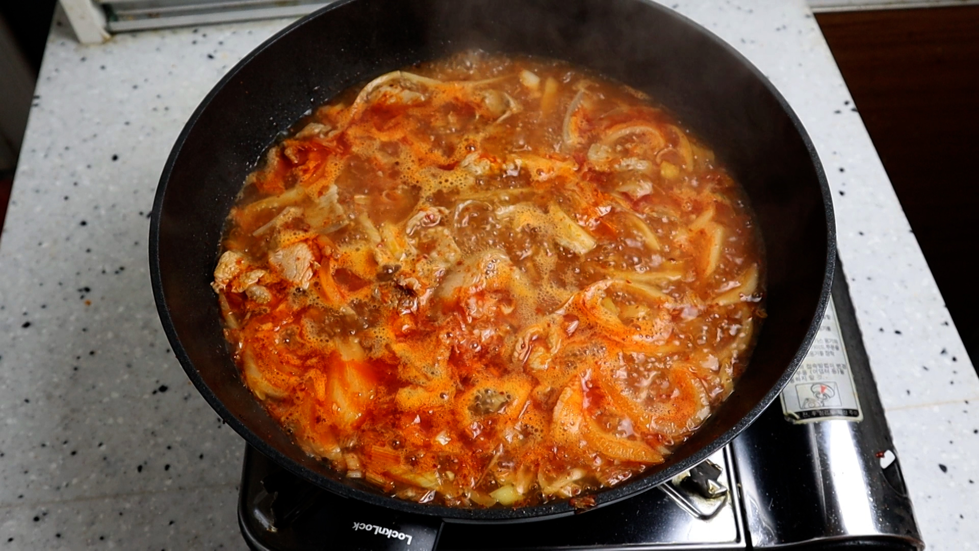 14. 양념을 넣고 물이 끓는 상태로 1분간 끓여주세요.