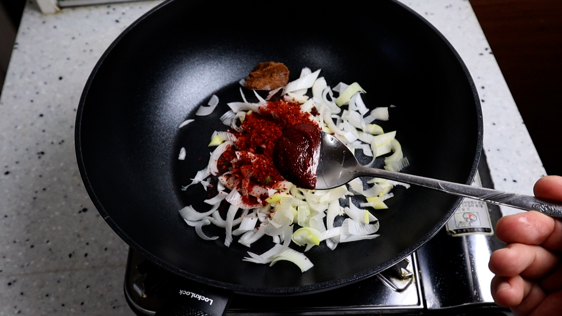 7. 식용유를 넣은 다음 불을 약불로 올리고 자글 거리기 시작하면 1분 30초 정도를 골고루 섞으며 볶아주세요. 고추장과 된장을 미리 한번 볶으면 국물이 더욱 맛있답니다.