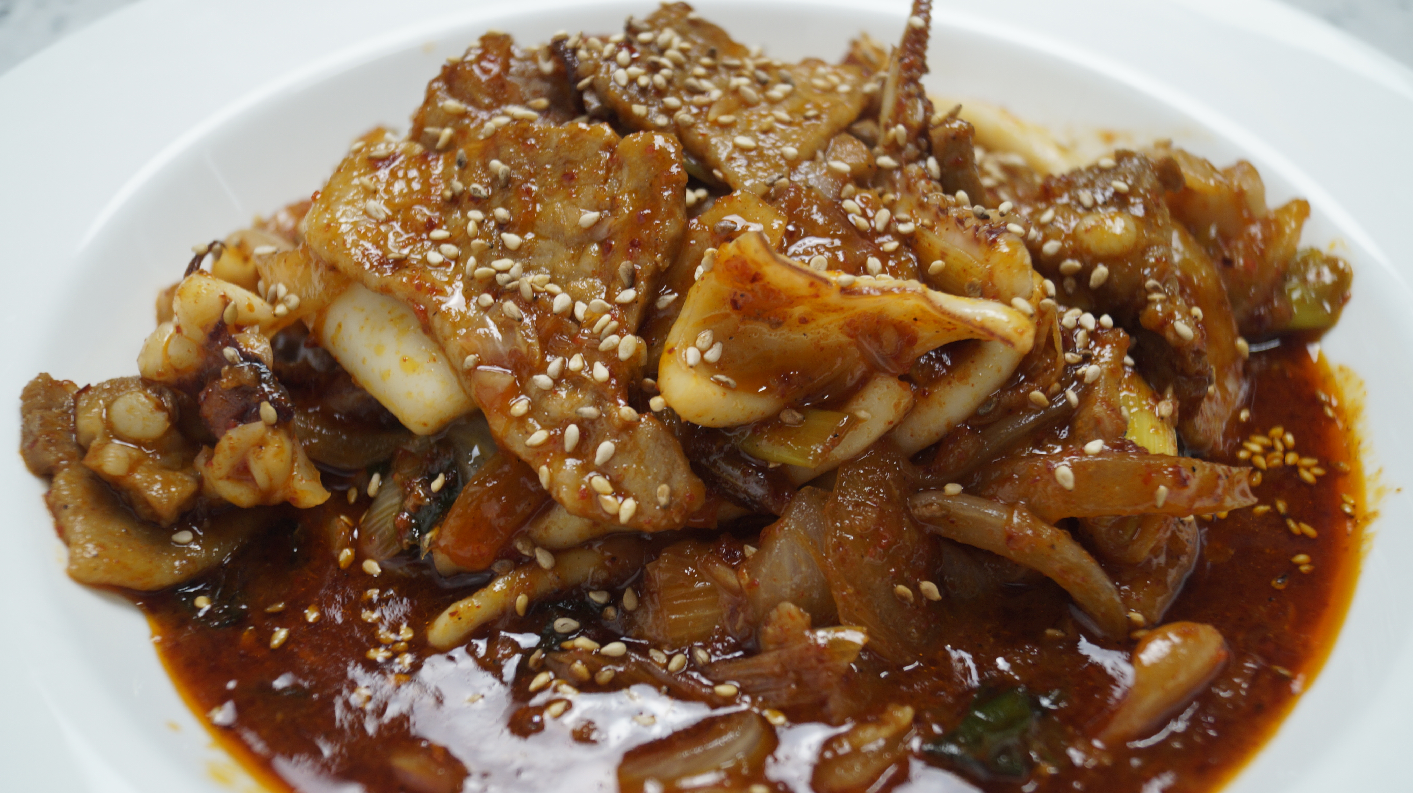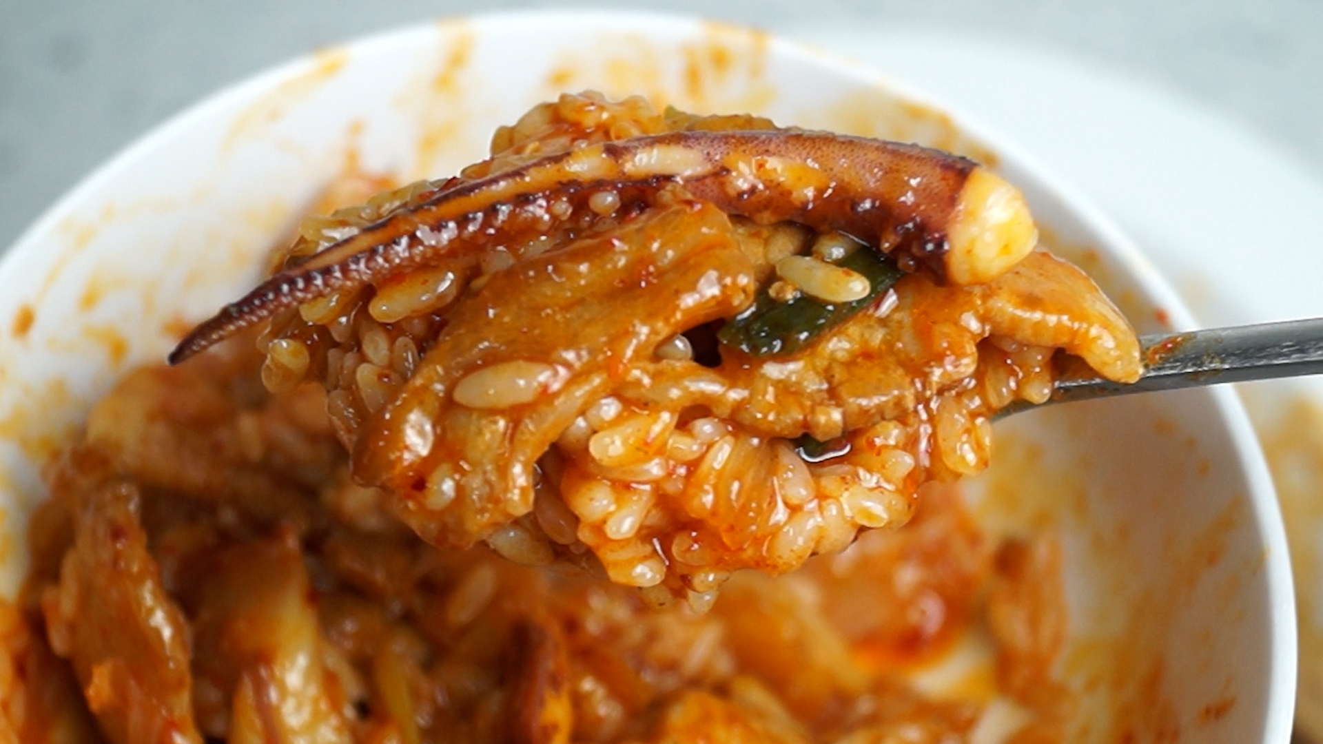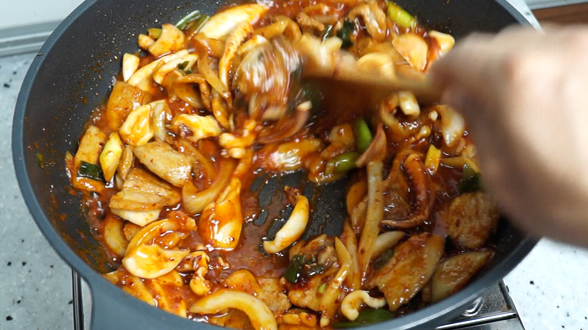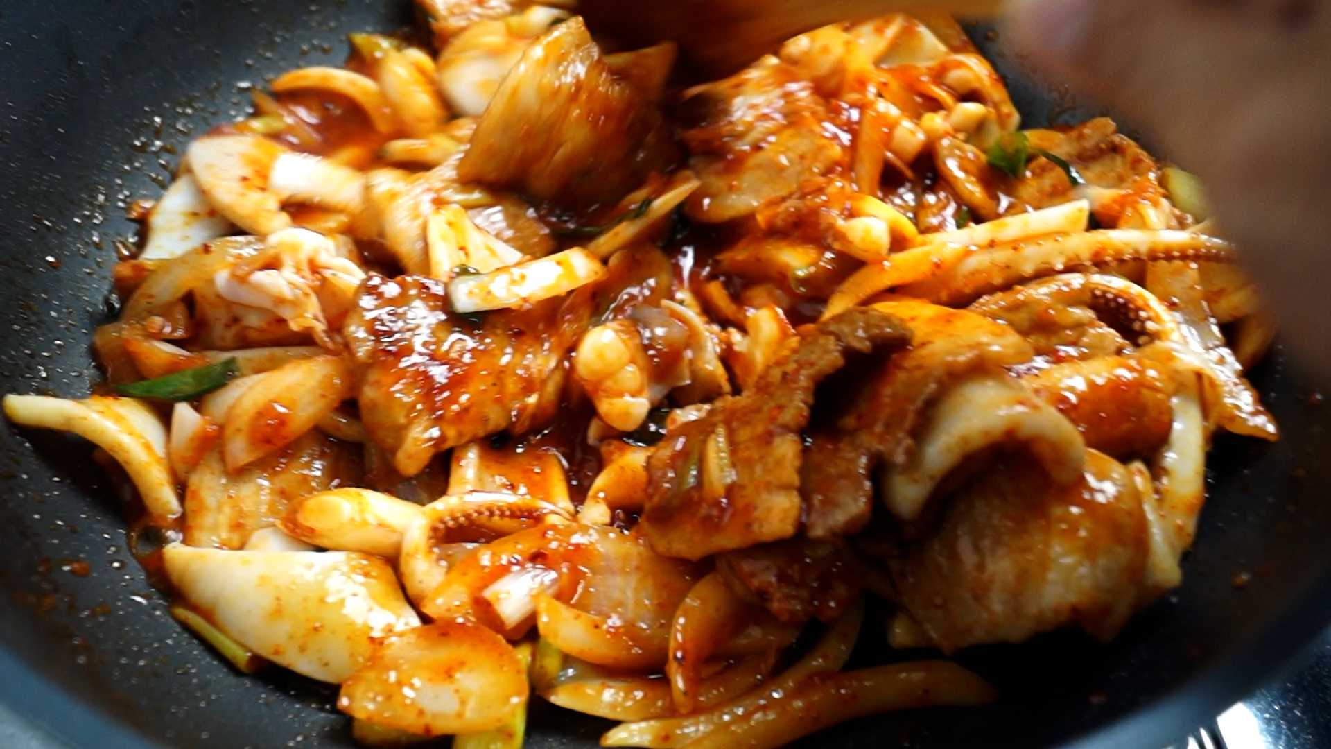 19. 오징어를 넣고 2분 정도를 더 볶아줍니다.
