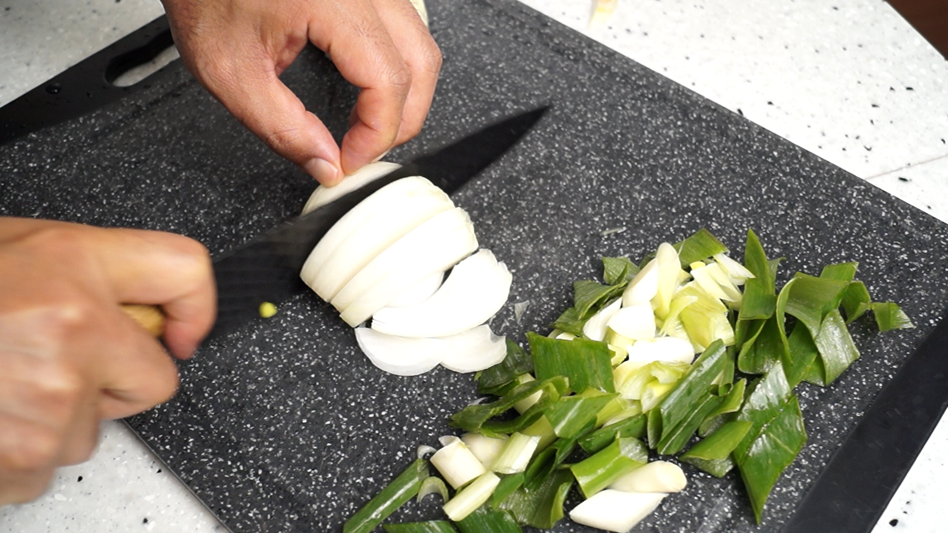 7. 양파는 대략 1cm 정도로 잘라주세요.두께가 좀 들쑥날쑥 해도 먹는덴 지장 없으니 너무 1cm 맞추려고 노력하지는 마세요