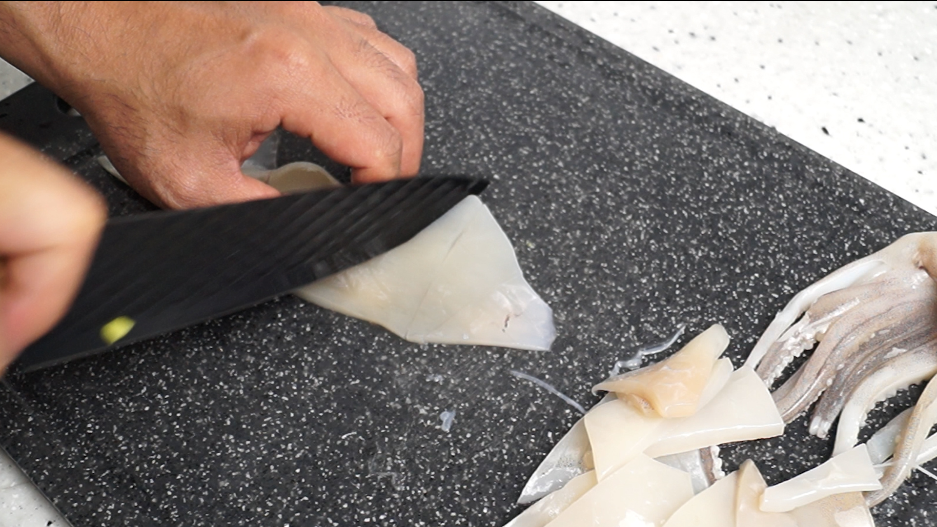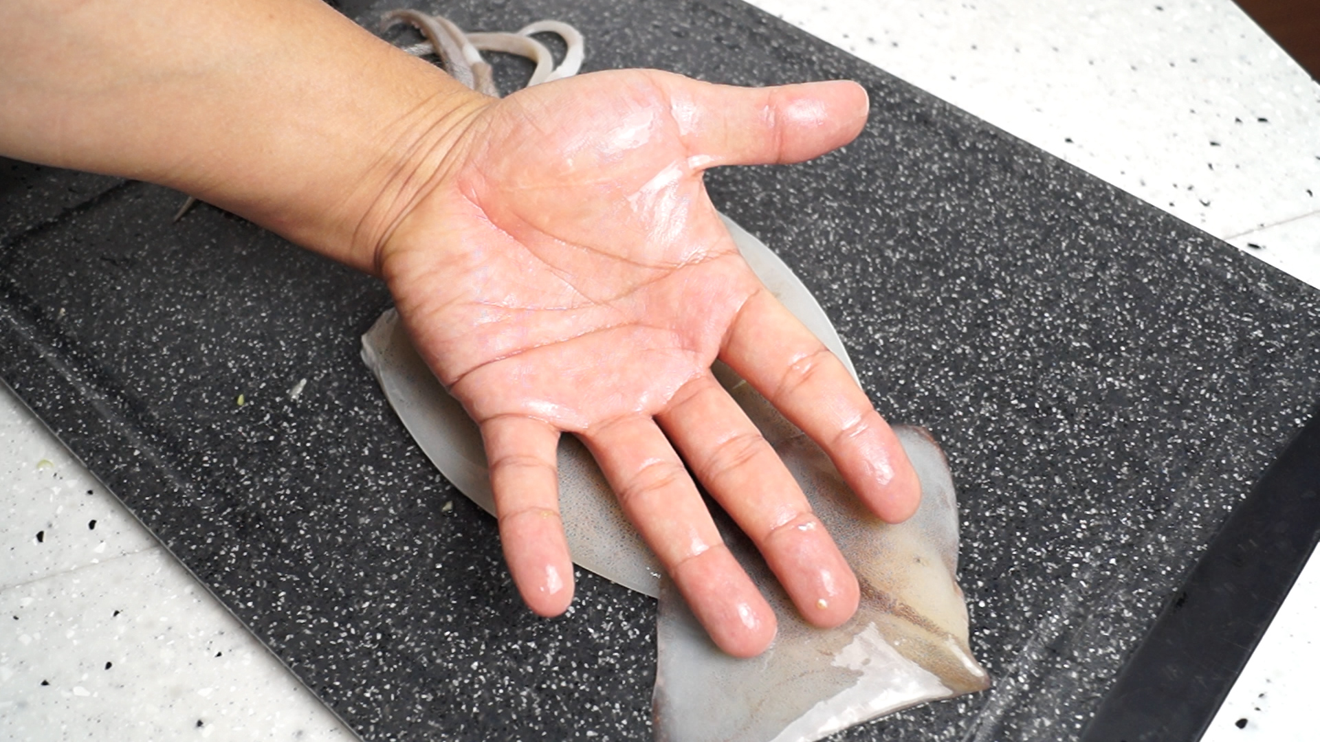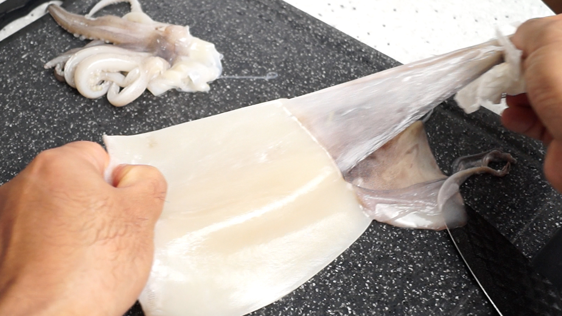 2. 오징어 껍질은 기호에 따라 제거를 해주셔도 되고 그냥 사용하셔도 됩니다. 키친 타월로 끝을 닦아가며 뜯어주시거나 소금으로 끝 부분을 살살 문질러서 뜯어 주시면 됩니다.