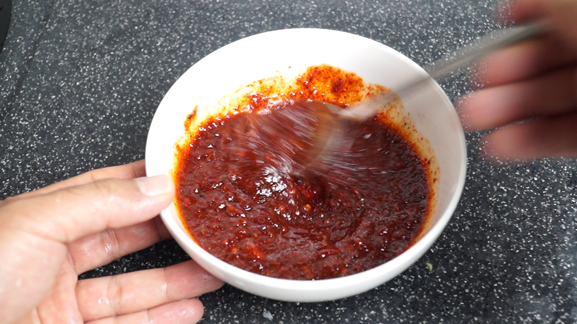 8. 양념장에 적힌 재료를 분량껏 전부 넣어주세요. 고춧가루 거슬거림을 줄이려고 저는 중간입자랑 고운입자 고춧가루 2개를 섞었는데 고운거 없으면 중간입자고춧가루를 그냥 사용하셔도 됩니다.