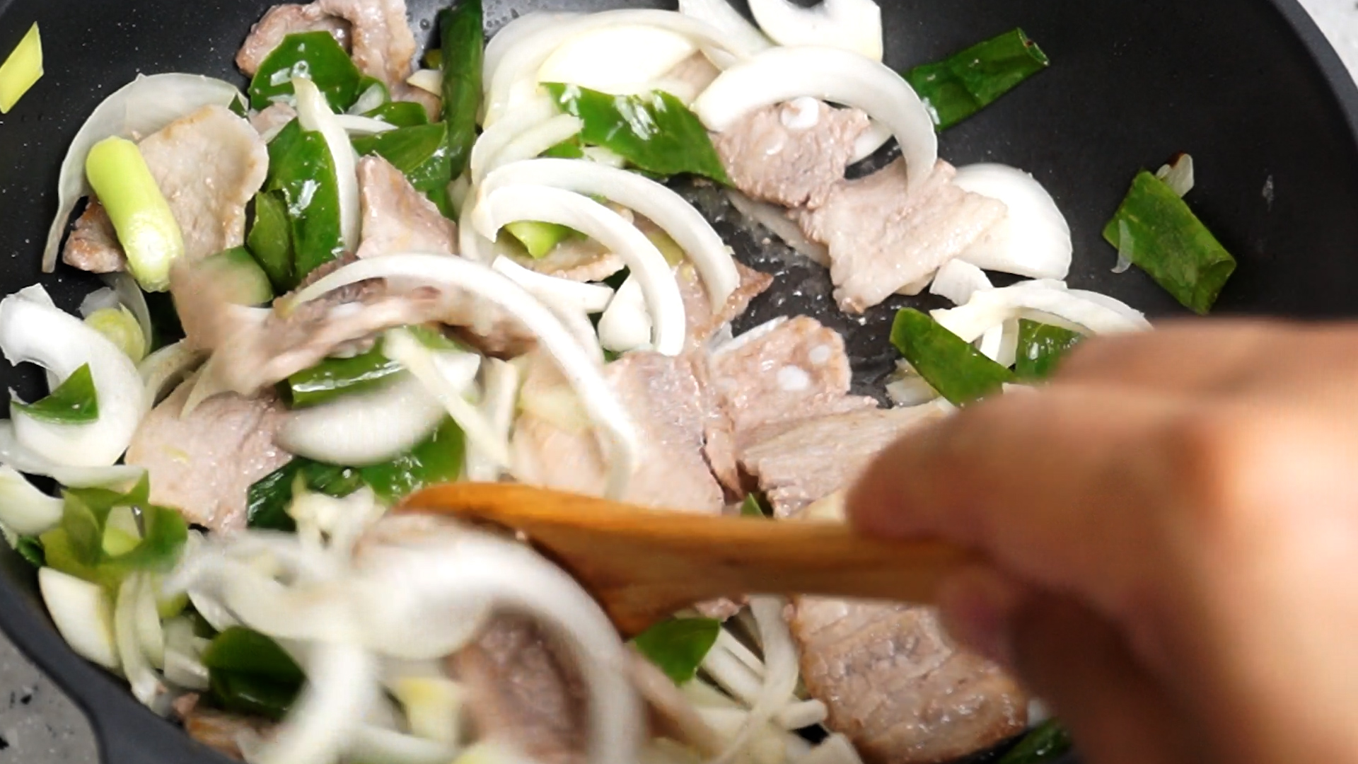 17. 야채를 전부 넣고 강불유지하고 1~2분을 볶아주세요. 앞다리살을 사용하셨으면 식용유 1스푼 정도를 넣어 주셔야 야채가 더 맛있게 볶아진답니다.