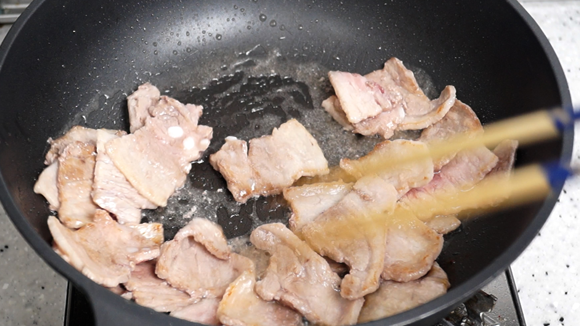 16. 강불로 달군 팬에 삼겹살을 넣고 볶아 핏기가 거의 사라지고 기름이 자글자글 나올때까지 볶아주세요.